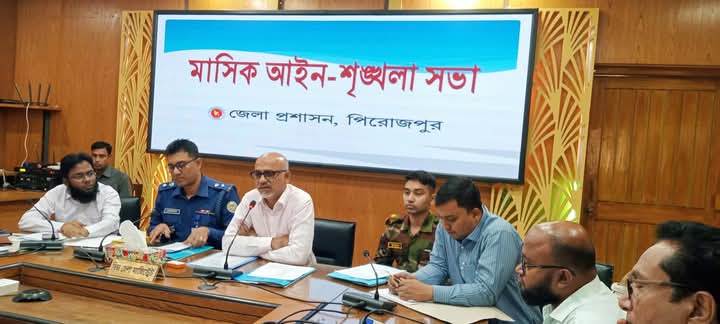 অদ্য ০৯/০৩/২০২৫ খ্রিস্টাব্দ পিরোজপুর জেলা প্রশাসকের কার্যালয়ে জেলার মাসিক আইন-শৃঙ্খলা কমিটির সভা অনুষ্ঠিত হয়। সভায় সভাপতির বক্তব্যে জেলা প্রশাসক উপজেলা নির্বাহী কর্মকর্তাগণকে স্থানীয় জনগণের অংশগ্রহণের মাধ্যমে আইন শৃঙ্খলা স্বাভাবিক রাখার বিষয়ে নির্দেশনা দেন। তিনি আসন্ন ঈদুল ফিতর উপলক্ষ্যে ঘরমুখো মানুষ যেন নিরাপদে ও স্বাচ্ছন্দ্যে বাড়ি আসতে পারে সে জন্য সড়কের নিরাপত্তা জোরদার এবং চুরি ডাকাতি প্রতিরোধে পুলিশ কে নিরাপত্তা টহল বাড়ানোর জন্য নির্দেশনা প্রদান করেন। একইসাথে, তিনি মাদকের বিরুদ্ধে অভিযান পরিচালনা অব্যাহত রাখা, দ্রব্যমূল্য নিয়ন্ত্রণে টাস্কফোর্সের কার্যক্রম বৃদ্ধি, রাতে পুলিশি টহল জোরদারসহ আইনশৃঙ্খলা স্বাভাবিক রাখার বিষয়ে সংশ্লিষ্ট সকলকে নির্দেশনা দেন। এ সময় তিনি আরও বলেন নির্বাচন উপলক্ষ্যে সকল দলের জন্য লেভেলপ্লেয়িং ফিল্ড তৈরি করার জন্য জেলা প্রশাসন কাজ করছে। জনগণ যেন নতুন বাংলাদেশে মত প্রকাশের স্বাধীনতা পায় এবং অবারিত সুখ অনুভব করতে পারে সেই বিষয়ে নিজের দৃঢ় প্রত্যয় ব্যক্ত করেন।