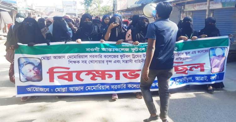 নওগাঁয় অনুষ্ঠিত আন্তঃকলেজ ফুটবল টুর্নামেন্টে চ্যাম্পিয়ন হওয়ার পর মোল্লা আজাদ মেমোরিয়াল সরকারি কলেজ দলের ওপর অতর্কিত হামলার প্রতিবাদে আত্রাইয়ে বিক্ষোভ মিছিল ও প্রতিবাদ সমাবেশ অনুষ্ঠিত হয়েছে। মঙ্গলবার (১৮ নভেম্বর) সকালে কলেজের শিক্ষক-কর্মচারী ও শিক্ষার্থীদের উদ্যোগে এ কর্মসূচি পালন করা হয়। জানা যায়, খেলায় সায়েম উদ্দিন মেমোরিয়াল স্কুল অ্যান্ড কলেজকে পরাজিত করার পর ফেরার পথে প্রতিপক্ষ প্রতিষ্ঠানের কিছু শিক্ষক, খেলোয়াড় ও বহিরাগতদের হামলায় মোল্লা আজাদ কলেজের তানভির, তোহা, নিরব, রায়হান, ইলিয়াস, জয়সহ কয়েকজন গুরুতর আহত হন। ঘটনার প্রতিবাদে সকাল ১১টায় কলেজ প্রাঙ্গণ থেকে বিক্ষোভ মিছিল বের হয়ে বিভিন্ন সড়ক প্রদক্ষিণ শেষে পুনরায় সেখানে সমাবেশে মিলিত হয়। বক্তারা হামলার তীব্র নিন্দা জানিয়ে দায়ীদের দৃষ্টান্তমূলক শাস্তি দাবি করেন। এ বিষয়ে আত্রাই উপজেলা নির্বাহী অফিসার (ভারপ্রাপ্ত) ও সহকারী কমিশনার (ভূমি) মোঃ নূরে আলম সিদ্দিক বলেন, ঘটনাটি গুরুত্বসহকারে দেখা হচ্ছে এবং দুই প্রতিষ্ঠানের সঙ্গে আলোচনা করে শান্তিপূর্ণ সমাধানের ব্যবস্থা নেওয়া হবে।