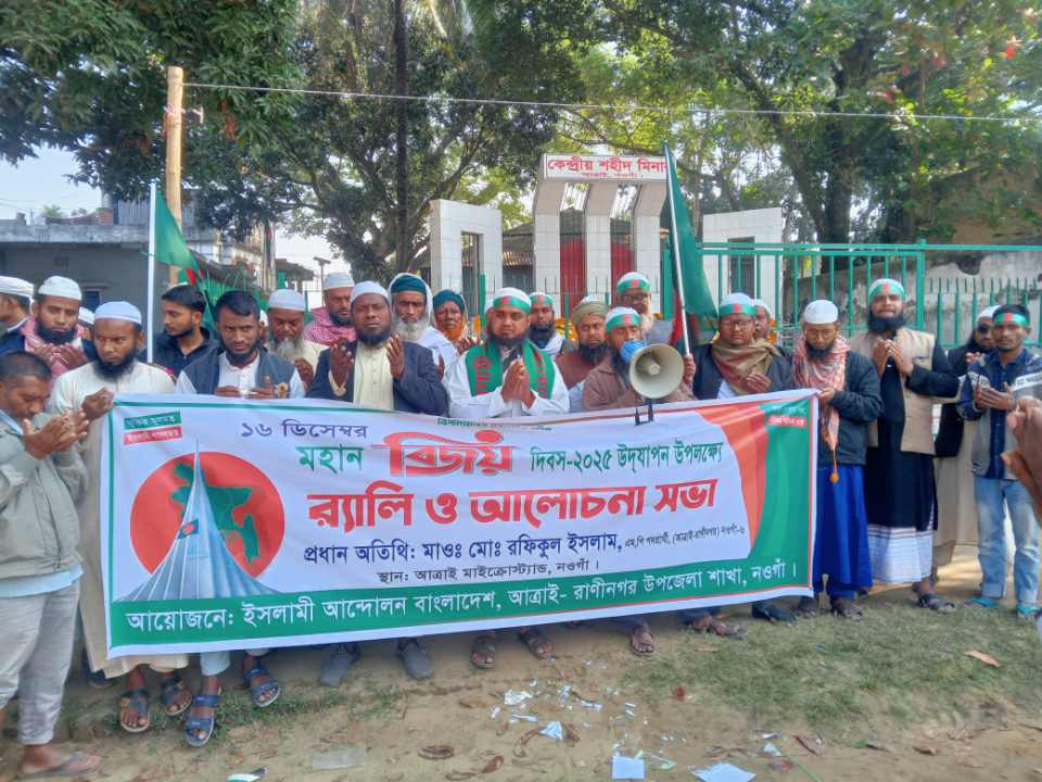 নওগাঁর আত্রাইয়ে ইসলামী আন্দোলন বাংলাদেশ আত্রাই উপজেলা শাখার উদ্যোগে যথাযোগ্য মর্যাদায় মহান বিজয় দিবস পালন করা হয়েছে। এ উপলক্ষে আলোচনা সভা ও র্যালির আয়োজন করা হয়।