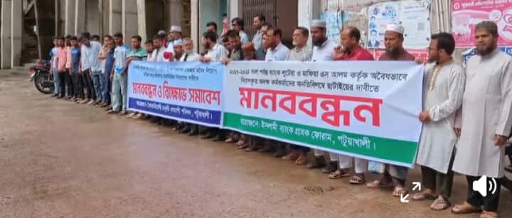 বাংলাদেশ ইসলামী ব্যাংকে এস আলম গ্রুপের দেওয়া অবৈধ নিয়োগ বাতিলের দাবিতে পটুয়াখালী বৈষম্য বিরোধী চাকুরী প্রত্যাশী পরিষদ ও ইসলামী ব্যাংক ফোরাম গ্রাহকদের আয়োজনে মানববন্ধন কর্মসূচি অনুষ্ঠিত হয়েছে। ৬ অক্টোবর ( শোমবার) পটুয়াখালী, ইসলামী ব্যাংক পটুয়াখালী শাখার সামনে আয়োজিত মানববন্ধনে মাওঃ নূরুল আমিন এর সঞ্চালনায় বক্তব্য রাখেন, পটুয়াখালী উন্নয়ন ফোরামের সভাপতি ও সাংস্কৃতিক জোটের সেক্রেটারী মোঃ শামিম, ইসলামী ব্যাংক গ্রাহক মাওঃ শহিদুল ইসলাম, সহ অন্যন্য। মানববন্ধনে বক্তারা তাদের বক্তব্যে বলেন, ইসলামী ব্যাংক অবৈধভাবে দখল করেছিল ফ্যাসিস্ট আওয়ামী সরকারের দোসর এস.আলম। ইসলামী ব্যাংক থেকে এস আলম গ্রুপ দূর্নীতি করে ৩৬ হাজার কোটি টাকা আত্মসাৎ করে বিদেশে পাচার করেছে । বক্তারা আরও বলেন, নিষিদ্ধ ছাত্রলীগের ক্যাডারদেরকে এই ব্যাংকে চাকরি দেওয়া হয়েছে অনিয়ম করে। ফ্যাসিস্ট এর দোসরদের চাকরি থেকে বরখাস্ত করে যোগ্যতার ভিত্তিতে চাকরি দিতে হবে। এসময় বিভিন্ন স্থান থেকে আগত ব্যক্তিবর্গ, ব্যাংক গ্রাহক সহ রেমিটেন্স যোদ্ধারা উপস্থিত ছিলেন।