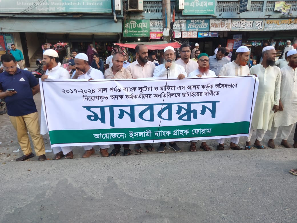 বাংলাদেশ ইসলামী ব্যাংকে এস আলম গ্রুপের দেওয়া অবৈধ নিয়োগ বাতিলের দাবিতে যশোরের ঝিকরগাছায় বৈষম্য বিরোধী চাকুরী প্রত্যাশী পরিষদ ও ইসলামী ব্যাংক গ্রাহক ফোরামের আয়োজনে মানববন্ধন কর্মসূচি অনুষ্ঠিত হয়েছে। ৬ অক্টোবর (রবিবার) ঝিকরগাছা বাসস্ট্যান্ড ইসলামী ব্যাংক ঝিকরগাছা শাখার সামনে আয়োজিত মানববন্ধনে সভাপতিত্ব করেন আমেরিকা প্রবাসী ও রেমিটেন্স হোল্ডার আব্দুল হামিদ। ব্যবসায়ী আমিনুর রহমান রবি'র সঞ্চালনায় বক্তব্য রাখেন, ঝিকরগাছা উন্নয়ন ফোরামের সভাপতি আবিদুর রহমান, ইসলামী ব্যাংক গ্রাহক সহকারী অধ্যাপক মশিউর রহমান, আসাদুজ্জামান আসাদ। মানববন্ধনে বক্তারা তাদের বক্তব্যে বলেন, ইসলামী ব্যাংক অবৈধভাবে দখল করেছিল ফ্যাসিস্ট আওয়ামী সরকারের দোসর এস.আলম। ইসলামী ব্যাংক থেকে এস আলম গ্রুপ দূর্নীতি করে ৩৬ হাজার কোটি টাকা আত্মসাৎ করে বিদেশে পাচার করেছে । বক্তারা আরও বলেন, নিষিদ্ধ ছাত্রলীগের ক্যাডারদেরকে এই ব্যাংকে চাকরি দেওয়া হয়েছে কোন দেওয়া হয়েছে অনিয়ম করে। ফ্যাসিস্ট এর দোসরদের চাকরি থেকে বরখাস্ত করে যোগ্যতার ভিত্তিতে চাকরি দিতে হবে। এসময় বিভিন্ন স্থান থেকে আগত ব্যক্তিবর্গ, ব্যাংক গ্রাহক সহ রেমিটেন্স হোল্ডার গন উপস্থিত ছিলেন।