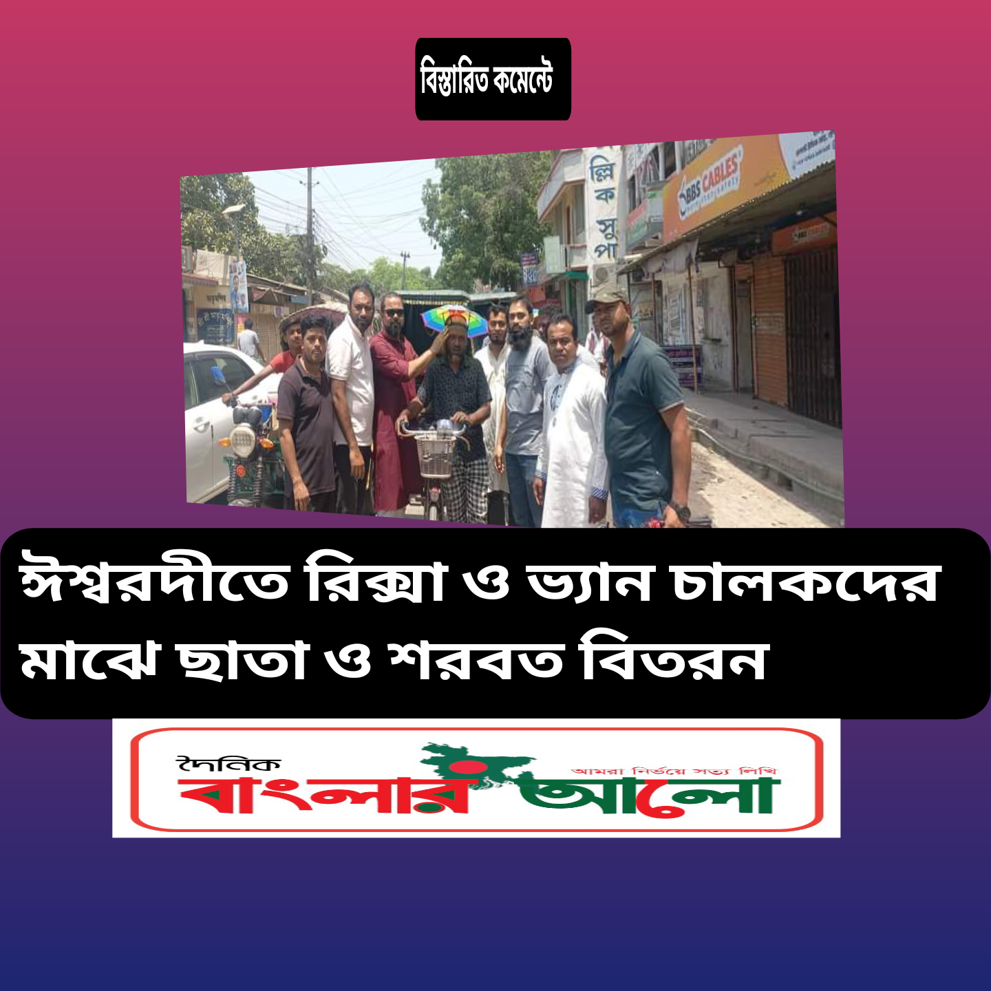 ঈশ্বরদীর শত বছরের ঐতিহ্যবাহী শিক্ষা প্রতিষ্ঠান এস এম স্কুল এন্ড কলেজের ২০০৩ সালের এসএসসি ব্যাচের শিার্থীদের উদ্যোগে তীব্র দাপদাহের মধ্যেও জীবিকা নির্বাহকারী রিক্সা ও ভ্যান চালকদের মাঝে ছাতা ও শরবত বিতরণ করা হয়েছে। শুক্রবার সকালে ঈশ্বরদী রেলওয়ে গেট এলাকায় বিভিন্ন রিক্সা ও ভ্যান চালকদের মাঝে শতাধিক মাথার ছাতা ও প্রায় এক হাজার গ্লাস শরবত বিতরণ করা হয়।