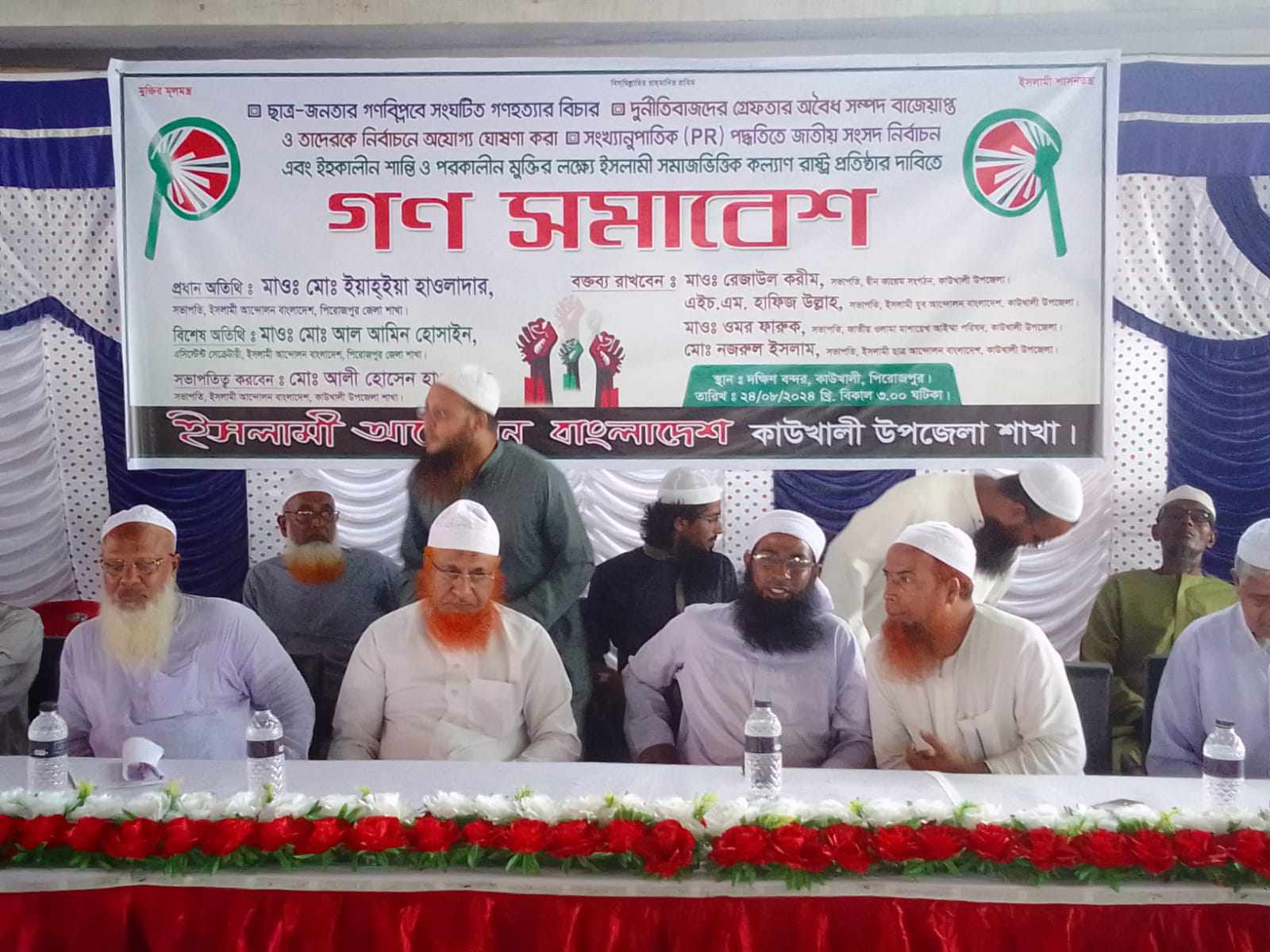 ছাত্র জনতার গণ বিপ্লবে সংঘটিত গণহত্যার বিচার, দুর্নীতিবাজদের গ্রেপ্তার, অবৈধ সম্পদ বাজেয়াপ্ত ও তাদেরকে নির্বাচনে অযোগ্য ঘোষণা করা সংখ্যানুপাতিক (পি আর) পদ্ধতিতে জাতীয় সংসদ নির্বাচন এবং ইহকালীন শান্তি ও পরকালীন মুক্তির লক্ষ্যে ইসলামী সমাজ ভিত্তিক কল্যাণ রাষ্ট্র প্রতিষ্ঠার দাবিতে আজকের এই গণ সমাবেশে প্রধান অতিথি হিসেবে উপস্থিত ছিলেন মাওঃ মোঃ ইয়াহ্হিয়া হাওলাদার - সভাপতি ইসলামী আন্দোলন পিরোজপুর জেলা শাখা,