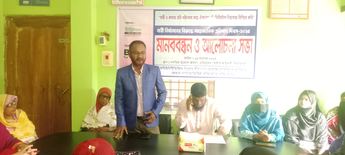 "নারী ও কন্যার প্রতি সহিংসতা বন্ধে ঐক্যবদ্ধ হই,ডিজিটাল নিরাপত্তা নিশ্চিত করি " এই প্রতিপাদ্যকে সামনে রেখে, পিরোজপুরের কাউখালীতে নারী নির্যাতনের বিরুদ্ধে আন্তর্জাতিক প্রতিবাদ দিবস-২০২৫ উপলক্ষে, মানববন্ধন ও আলোচনা সভার আয়োজন করেন বেসরকারি প্রতিষ্ঠান এনজিও নাগরিক উদ্যোগ।