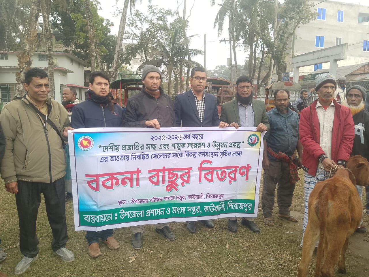 পিরোজপুরের কাউখালী উপজেলায় ২০২৫–২৬ অর্থবছরের “দেশীয় প্রজাতির মাছ ও শামুক সংরক্ষণ এবং উন্নয়ন প্রকল্প”-এর আওতায় নিবন্ধিত জেলেদের মাঝে বিকল্প কর্মসংস্থান সৃষ্টির লক্ষ্যে দেশীয় বকনা বাছুর বিতরণ করা হয়েছে। উপজেলা প্রশাসন ও মৎস্য অধিদপ্তরের উদ্যোগে ৫ জানুয়ারী সোমবার, উপজেলা পরিষদ চত্বরে,৫টি ইউনিয়নের ৬০ জন নিবন্ধিত জেলের মাঝে একটি করে দেশীয় বকনা বাছুর প্রদান করা হয়। প্রকল্পের আওতায় জেলেদের জীবিকায় বৈচিত্র্য আনা এবং মাছের প্রজনন মৌসুমে বিকল্প আয়ের সুযোগ সৃষ্টি করাই এ কার্যক্রমের মূল লক্ষ্য। সংশ্লিষ্ট কর্মকর্তারা জানান,দেশীয় প্রজাতির মাছ ও শামুক সংরক্ষণে জেলেদের সম্পৃক্ত করতে এবং প্রাকৃতিক জলাশয়ে মাছ আহরণে চাপ কমাতে এ ধরনের সহায়তা কার্যকর ভূমিকা রাখবে। পাশাপাশি গবাদি পশু পালনের মাধ্যমে জেলেদের আর্থিক স্বাবলম্বিতা বাড়বে। এ সময় বকনা বাছুর পরিদর্শন সহ বিতরণে উপস্থিত ছিলেন,উপজেলা নির্বাহী কর্মকর্তা মোঃ আসাদুজ্জামান, উপজেলা ভূমি কমিশনার সুদীপ্ত দেবনাথ,উপজেলা মৎস্য কর্মকর্তা মোঃ হাফিজুর রহমান,৩নং সদর ইউনিয়ন চেয়ারম্যান মোঃ মোস্তাফিজুর রহমান। সাংবাদিক মোঃ মেহেদী হাসান নয়ন, মো: রফিকুল ইসলাম এবং প্রকল্প সংশ্লিষ্ট কর্মকর্তা ও উপকারভোগী জেলেরা উপস্থিত ছিলেন।