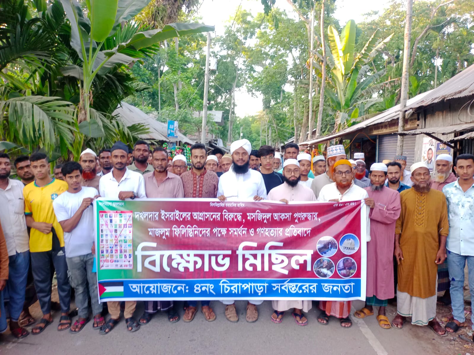 অদ্য ৯ এপ্রিল বুধবার -২০২৫ তারিখ, বৈকাল ৫ ঘটিকার সময় পিরোজপুরের কাউখালী উপজেলার ৪নং চিড়াপাড়া ইউনিয়নের গাজিরউলা বাজার সড়ক থেকে শুরু করে প্রতিবাদী স্লোগানের মধ্য দিয়ে বেকুটিয়া ব্রিজ সংলগ্ন নতুন বাজারে এসে শেষ করা হয়। উক্ত বিক্ষোভ মিছিলে এলাকার সর্বস্তরের জনসাধারণ ও ব্যবসায়ীগনের উপস্থিতিতে "যুদ্ধ বিরতি লংঘন করে ফিলিস্তিনির গাজায় সন্ত্রাসী ইসরায়েলি বাহিনীর বর্বর গণহত্যার প্রতিবাদে" বিক্ষোভ মিছিল শেষে মানববন্ধন অনুষ্ঠিত হয়। উক্ত বিক্ষোপ মিছিলটি ব্যবসায়ী মোঃ আব্দুর রাজ্জাক এর নেতৃত্বে আয়োজন করা হয় অতঃপর বক্তব্য রাখেন, মাওলানা মোঃ মতিউর রহমান,মোঃ আমিনুল ইসলাম ইমাম ও খতিব, এ সময় বক্তারা ফিলিস্তিনের গাজায় বর্বর ইসরায়েলী গনহত্যার তীব্র নিন্দা ও প্রতিবাদ জানানোর পাশাপাশি জাতিসংঘ সহ মানবাধিকার সংগঠন গুলোর প্রতি গনহত্যা বন্ধের জন্য সন্ত্রাসী ইসরায়েলকে চাপ সৃষ্টি করার দাবি জানান। বাংলাদেশে ইসরায়েল কে সহায়তা করে এমন কোম্পানির পন্য বয়কটের দাবি জানান। মুসলিম উম্মাহর হৃদয়ের স্পন্দন আল আকসা মসজিদ আজ ভয়াবহ আগ্রাসনের শিকার। ইসলামের প্রথম কিবলা, ঐতিহাসিক ও ধর্মীয় গুরুত্বপূর্ণ এই স্থানকে ঘিরে ইসরায়েলি বাহিনীর বর্বরতা মানবতাবিরোধী অপরাধ। অবিলম্বে তারা এই গণহত্যা বন্ধে আন্তর্জাতিক সম্প্রদায়ের কঠোর হস্তক্ষেপের দাবি জানান।