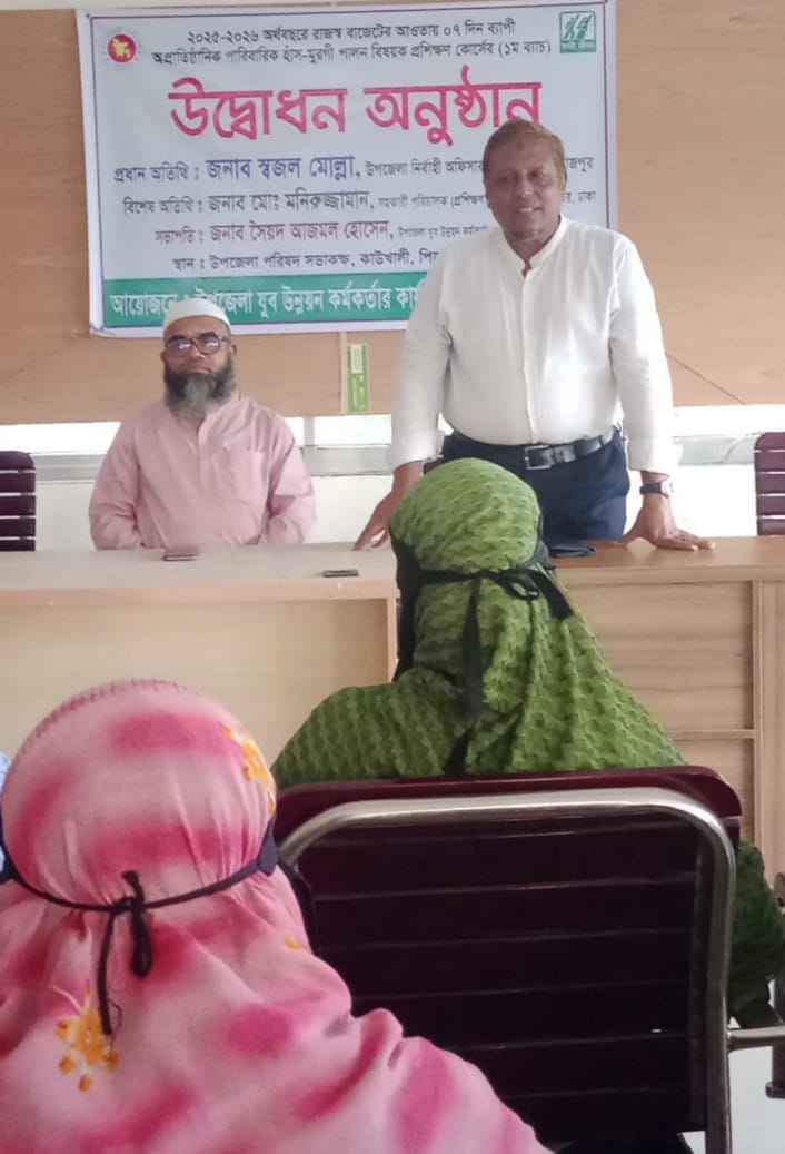 পিরোজপুর জেলাধীন কাউখালী উপজেলা যুব উন্নয়ন অধিদপ্তরের আয়োজনে,৭দিন ব্যাপি "পারিবারিক হাস-মুরগী পালন" (১ম ব্যাচ) বিষয়ক প্রশিক্ষণ কোর্সের শুভ উদ্বোধন হয়। রবিবার(২৮সেপ্টেম্বর) বৈকাল ৪ ঘটিকার সময়,কাউখালী উপজেলা পরিষদ সভাকক্ষে উক্ত প্রশিক্ষণের আয়োজন করা হয়। প্রশিক্ষণটি যুব ও ক্রীড়া মন্ত্রণালয়ের অধীনে ২০২৫-২৬ অর্থবছরের রাজস্ব বাজেটের আওতায় বিভিন্ন ট্রেডে প্রশিক্ষণের ধারাবাহিকতায় রবিবার আয়োজিত প্রশিক্ষণে, উপজেলা যুব উন্নয়ন কর্মকর্তা, সৈয়দ আজমল হোসেনের সভাপতিত্বে,প্রধান অতিথি হিসেবে উপস্থিত ছিলেন,মোঃ মনিরুজ্জামান সহকারি পরিচালক(প্রশিক্ষন)যুব উন্নয়ন অধিদপ্তর ঢাকা। প্রশিক্ষণটি ২৮সেপ্টেম্বর থেকে ০৫ অক্টোবর পর্যন্ত ৭দিন চলমান থাকবে। একটি প্রশিক্ষণ ট্রেডে মোট ৩০ জন ১৮-৩৫ বছর যুবক ও যুবনারীর অংশগ্রহণ করে। প্রশিক্ষণের শুরুতে শিক্ষার্থীদের মাঝে খাতা ও কলম প্রদান করা হয়। এছাড়াও প্রশিক্ষণ শেষে যাতায়াত সন্মানী স্বরূপ প্রতিদিন ১০০ টাকা করে এবং সর্বশেষে একটি সনদ পত্র প্রদান করা হবে। যাতে করে পরবর্তীতে প্রশিক্ষনার্থী যুব উন্নয়ন অধিদপ্তর কর্তৃক স্বল্প হারে ঋণ গ্রহণ করে স্বাবলম্বী হতে পারে।