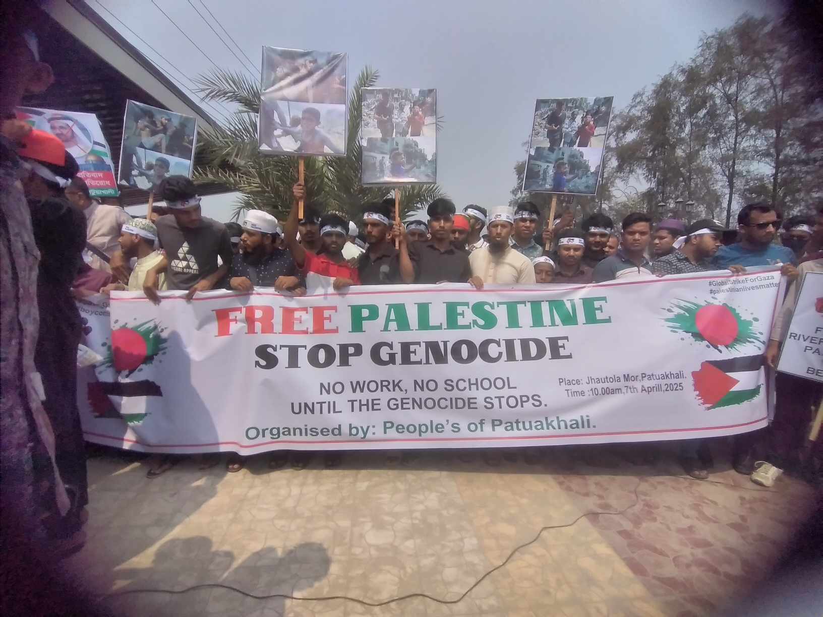 পটুয়াখালী মুসলিম জনতার উদ্যোগে ফিলিস্তিনের মসুলমানদের গনহত্যা বন্ধ ও তাদের বাসস্থান দখলের প্রতিবাদে বিক্ষোপ মিছিল অনুষ্ঠিত হয়েছে। সোমবার (৭ এপ্রিল) সকাল ১০টায় পটুয়াখালী ঝাউতলা থেকে প্রতিবাদ মিছিলটি শুরু হয়ে চৌরাস্তা বাসস্ট্যান্ডে সংক্ষিপ্ত পথসভার মধ্য দিয়ে শেষ হয়। মুসলিম জনতার ব্যানারে পটুয়াখালী বড় জামে মসজিদের খতিব আলহাজ্জ মাওলানা মোঃ আবুসাঈদ ও পৌরসভা জামে মসজিদের ইমাম সাহেব ফিলিস্তিনের মসুলমানদের উপর ইসরায়েলের ন্যাক্কার জনক হামলা ও গনহত্যার প্রতিবাদ জানিয়ে তাদের বক্তব্যে ইসরায়েলকে সন্ত্রাসী রাষ্ট্র ঘোষণা, অনতিবিলম্বে গনহত্যা বন্ধ করা ও সারা দেশের ইসরায়েলের পণ্য বয়কট করার বর্তমান প্রধান উপদেস্টা ডঃ ইউনুচ সরকারের প্রতি আহবান জানান।