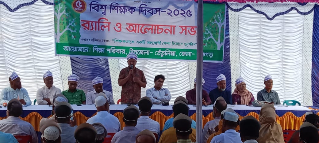শিক্ষকদের হাত ধরেই শিক্ষা ব্যবস্থার রূপান্তর শুরু’-এ প্রতিপাদ্যকে সামনে রেখে পঞ্চগড়ে তেতুলিয়ায় বিশ্ব শিক্ষক দিবস (২০২৫) পালিত হয়েছে। রোববার (৫ অক্টোবর) বেলা ১১টায় একটি বর্ণাঢ্য র্যালি বের হয়ে শহরের প্রধান সড়ক প্রদক্ষিণ শেষে চৌরাস্তা বাজারের তেতুলতলায় শেষ হয়। পরে সেখানে অনুষ্ঠিত হয় আলোচনা সভা। এতে অংশ নেন তেঁতুলিয়ার শিক্ষা প্রতিষ্ঠানগুলোর শিক্ষকবৃন্দ। তেতুলিয়া উপজেলা শাখার শিক্ষক সমিতির সভাপতি ও ভিপি উচ্চ বিদ্যালয়ের প্রধান শিক্ষক হারুণ অর রশিদের সভাপতিত্বে অনুষ্ঠানে প্রধান অতিথি হিসেবে উপস্থিত ছিলেন সহকারী কমিশনার (ভুমি) এম এ আকাশ। এ সময় তেঁতুলিয়া সরকারি কলেজের শিক্ষক কাজিউল ইসলাম, প্রাথমিক বিদ্যালয়ের প্রধান শিক্ষক মকবুলার রহমান, হাইস্কুলের প্রধান শিক্ষক আজিজুল হক, শিক্ষক সমিতির সাধারণ সম্পাদক ফারুক হোসেনসহ বিভিন্ন প্রতিষ্ঠানের প্রধান শিক্ষক, সহকারি শিক্ষক ও কলেজের শিক্ষকবৃন্দ।