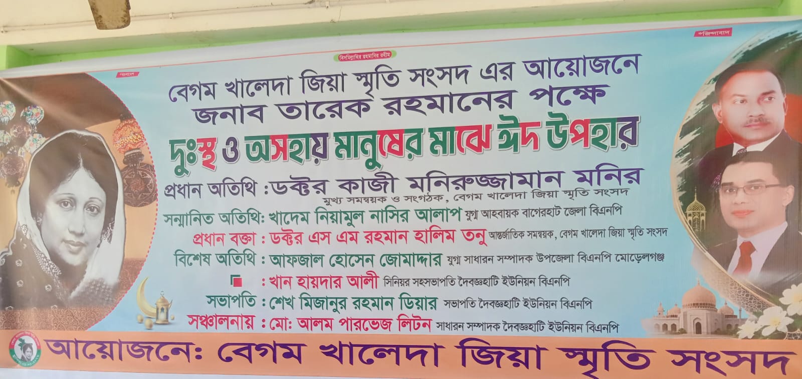 পবিত্র ঈদুল ফিতর উপলক্ষে বাগেরহাটের মোড়েলগঞ্জ উপজেলার দৈবজ্ঞহাটী ইউনিয়নের হাশেম খার হাটে দুঃস্থ ও অসহায় মানুষের মাঝে ঈদ উপহার বিতরণ করা হয়েছে। মঙ্গলবার (১৭ মার্চ ২০২৬), ২৭ রমজান বিকেলে এ কর্মসূচির আয়োজন করে বেগম খালেদা জিয়া স্মৃতি সংসদ। অনুষ্ঠানে প্রধান অতিথি হিসেবে উপস্থিত ছিলেন ডক্টর কাজী মনিরুদ্দুজ্জামান মনির, মুখ্য সমন্বয়ক ও সংগঠক, বেগম খালেদা জিয়া স্মৃতি সংসদ। প্রধান বক্তা হিসেবে বক্তব্য রাখেন ডক্টর এস এম রহমান হালিম তনু, আন্তর্জাতিক সমন্বয়ক, বেগম খালেদা জিয়া স্মৃতি সংসদ।