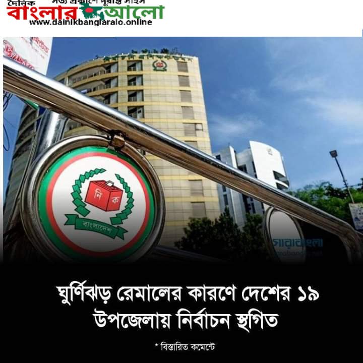 ঘূর্ণিঝড় রেমালের প্রভাবে ক্ষতিগ্রস্থ দেশের ৯ জেলার ১৯টি উপজেলা পরিষদ নির্বাচন স্থগিত করেছে নির্বাচন কমিশন (ইসি)। ফলে আগামী ২৯ মে অনুষ্ঠিত হতে যাওয়া তৃতীয় ধাপের ১৯টি উপজেলা নির্বাচন স্থগিত থাকবে। উপজেলাগুলো হলো- বাগেরহাটের শরণখোলা, মোরেলগঞ্জ, মোংলা, খুলনার কয়রা, পাইকগাছা, ডুমুরিয়া, বরিশালের গৌরনদী, আগুনঝারা, পটুয়াখালীর পটুয়াখালী সদর, মির্জাগঞ্জ, দুমকি, পিরোজপুরের মঠবাড়িয়া, ভোলার তজুমদ্দিন, লালমোহন, ঝালকাঠির রাজাপুর, কাঁঠালিয়া, বরগুনার বামনা, পাথরঘাটা এবং রাঙ্গামাটির বাঘাইছড়ি উপজেলা।
