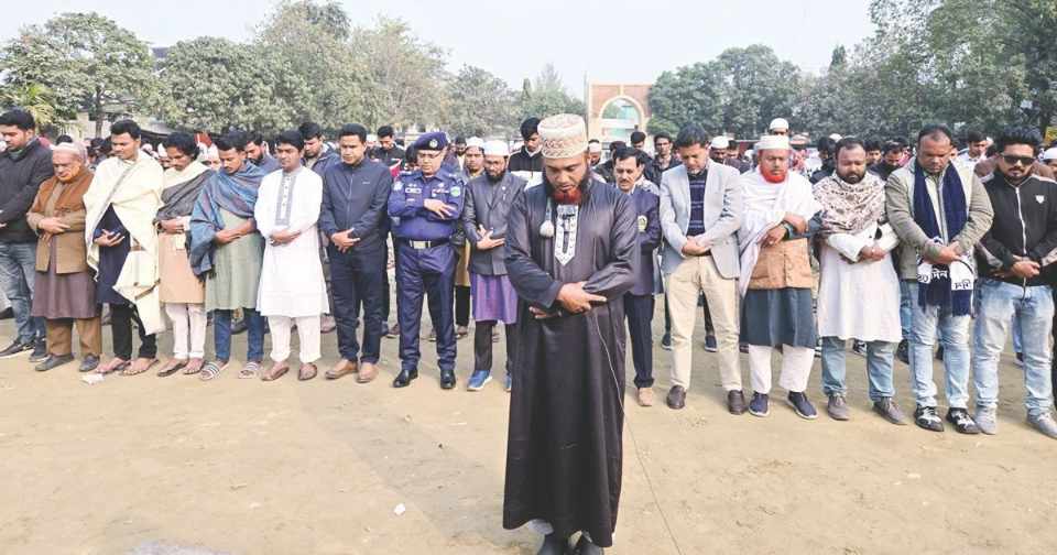 জানাজায় প্রশাসনের কর্মকর্তা, বিএনপি, জামায়াত, ইসলামী আন্দোলন বাংলাদেশ, হেফাজতে ইসলাম, এবি পার্টি ও বৈষম্যবিরোধী ছাত্র আন্দোলনসহ বিভিন্ন রাজনৈতিক দলের নেতা-কর্মীরা অংশ নেন। জানাজার আগে সংক্ষিপ্ত সমাবেশে বক্তারা ওসমান হাদির হত্যার বিচার দাবি করেন এবং তাকে দেশের গণতান্ত্রিক আন্দোলনের একজন গুরুত্বপূর্ণ কণ্ঠ হিসেবে উল্লেখ করেন। এ সময় নওগাঁর পুলিশ সুপার মোহাম্মদ তারিকুল ইসলাম বলেন, ওসমান হাদী হত্যার রহস্য উদঘাটন ও বিচার নিশ্চিত করতে পুলিশ কাজ করছে এবং জেলার শান্তিশৃঙ্খলা রক্ষায় আইনশৃঙ্খলা বাহিনী তৎপর রয়েছে।
