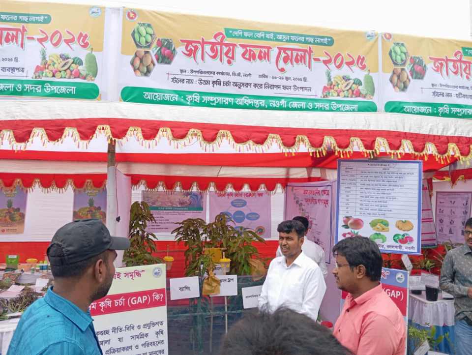 মেলায় বিভিন্ন স্টলে প্রদর্শিত হয়েছে আম, লিচু, কাঁঠাল, পেয়ারা, ডালিম, বেল, জাম, আনারস, সফেদা, ড্রাগন ফলসহ নানা ধরনের দেশি ফল। প্রতিটি ফলের পাশে লেবেলসহ প্রদর্শিত হয়েছে জাত, উৎপাদন পদ্ধতি এবং পুষ্টিগুণ সম্পর্কিত তথ্য। ফল প্রদর্শনের পাশাপাশি ছিলো GAP (Good Agricultural Practices) ভিত্তিক ফল উৎপাদনের মানসম্মত প্রক্রিয়া সম্পর্কিত সচেতনতামূলক পোস্টার ও প্রেজেন্টেশন। মেলায় কৃষকেরা তাদের উৎপাদিত ফল ও উদ্ভাবনী পদ্ধতি প্রদর্শনের সুযোগ পান। এই মেলায় অংশগ্রহণকারী একজন কৃষক জানান, “এধরনের মেলা আমাদের উৎসাহিত করে উন্নত জাতের ফল চাষে। একইসঙ্গে প্রযুক্তি ও বাজার সম্পর্কে ভালো ধারণা পাওয়া যায়।” মেলায় কৃষি প্রযুক্তি সম্পর্কিত স্টলেও গুরুত্ব দেওয়া হয়। স্টলে কৃষি অ্যাপ, ডিজিটাল সেবা, প্রক্রিয়াজাত পণ্য যেমন—জ্যাম, জেলি, আচার, ফল নির্যাস ইত্যাদিও প্রদর্শিত হয়েছে। এসব প্রযুক্তি স্টল কৃষকদের মাঝে ব্যাপক আগ্রহ সৃষ্টি করেছে। কৃষি সম্প্রসারণ অধিদপ্তরের সূত্র মতে, নওগাঁ জেলায় এ বছর আম চাষের আওতায় ৬ হাজার ৪০০ হেক্টরের বেশি জমি রয়েছে, যা দেশের অন্যতম বৃহৎ আম উৎপাদক অঞ্চলের মধ্যে পড়ে। ফল উৎপাদনে এ অঞ্চলকে রফতানির জন্য প্রস্তুত করতে এমন মেলা গুরুত্বপূর্ণ ভূমিকা রাখবে বলেও জানান কর্মকর্তারা। মেলার শেষ দিনে ফল চাষে অবদান রাখা কৃষক ও সেরা স্টলকে পুরস্কৃত করার ঘোষণাও দেওয়া হয়েছে। এতে কৃষকদের মধ্যে প্রতিযোগিতা ও উদ্দীপনা তৈরি হয়েছে। এ জাতীয় ফল মেলা দেশের খাদ্য নিরাপত্তা, পুষ্টি সচেতনতা এবং কৃষিভিত্তিক অর্থনীতিকে টেকসই করে তুলতে সহায়ক ভূমিকা রাখবে বলেও মনে করছেন সংশ্লিষ্টরা।