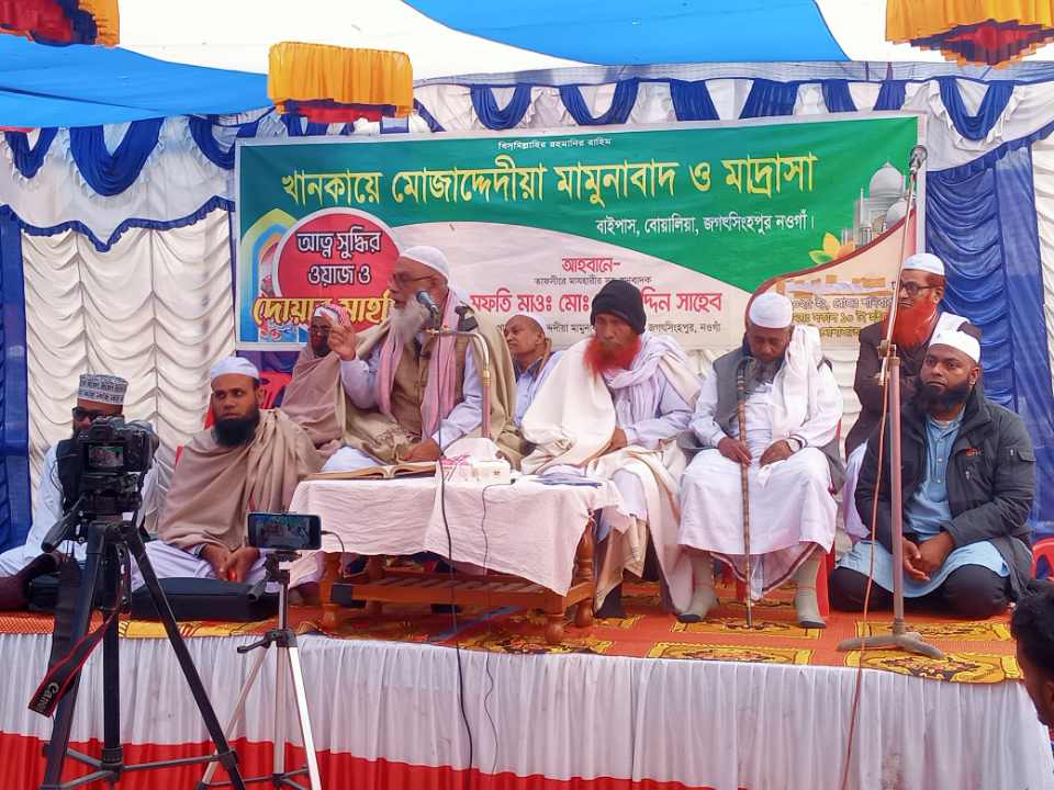 নওগাঁর মামুনাবাদ বাইপাস সংলগ্ন বোয়ালিয়া জগৎসিংহপুর এলাকায় খাস মোজাদ্দেদিয়া তরিকার উদ্যোগে বাৎসরিক ওয়াজ মাহফিল ও মকতুবাদ শরীফ অনুষ্ঠিত হয়েছে। শনিবার (২০ ডিসেম্বর ২০২৫) সকাল ১০টা থেকে দিনব্যাপী এ ধর্মীয় মাহফিল অনুষ্ঠিত হয়। মাহফিল পরিচালনা করেন মোজাদ্দেদে মিয়াত, মাযহারুস সুন্নাহ হযরত খাজা মোহাম্মদ মামুনুর রশীদ (র.)-এর খলিফা, তাফসীরে মাযহারীর সহঅনুবাদক এবং মামুনাবাদ খানকা শরীফের কামেলে মোকাম্মেল পীর সাহেব মুফতী মাওলানা মোহাম্মদ নাজিমুদ্দিন মাদ্দাজিল্লুহুল আলিয়া।