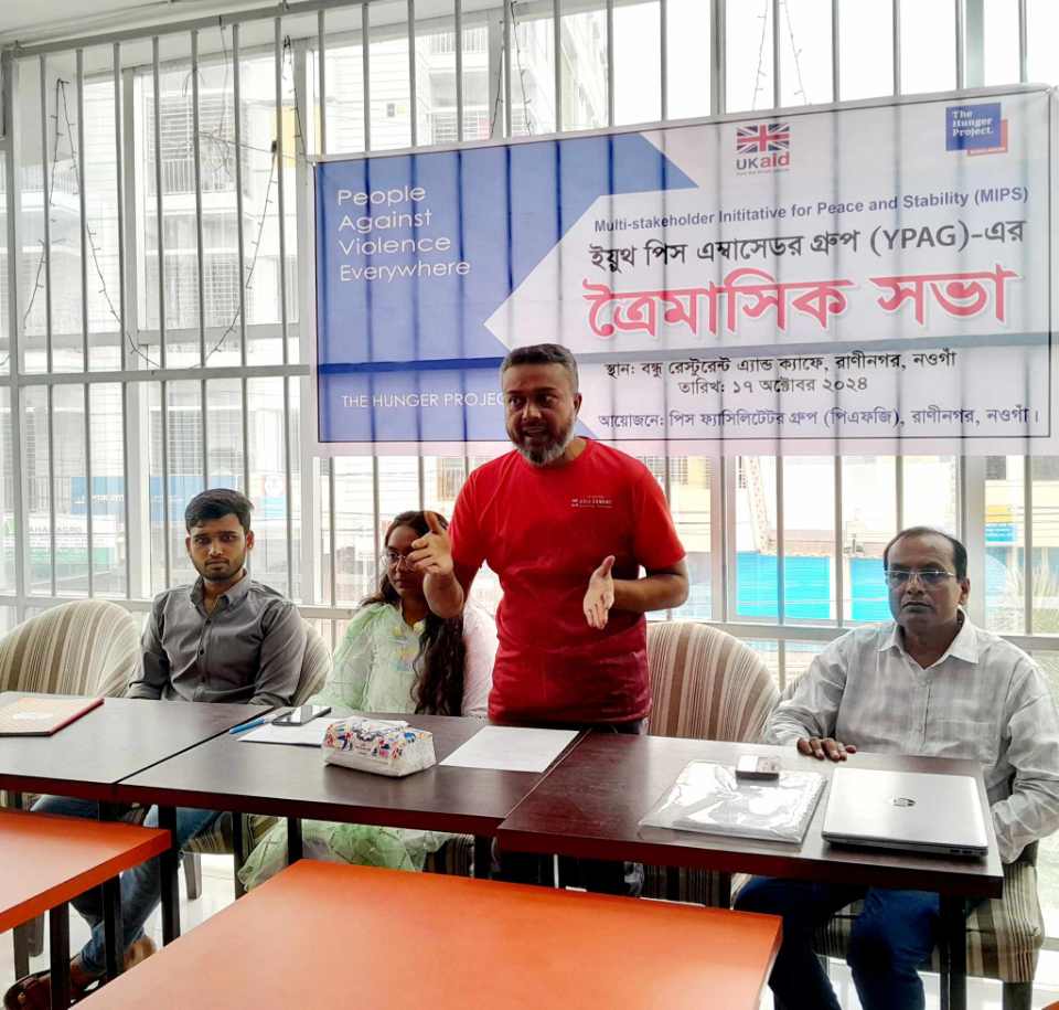 নওগাঁর রাণীনগরে আজ বৃহস্পতিবার ১৭ অক্টোবর ২০২৪ উপজেলা সদরের বন্ধু রেস্টুরেন্টে দি হাঙ্গার প্রজেক্ট বাংলাদেশ’র সার্বিক সহযোগিতায় ও ইয়ুথ পিস এম্বাসেডর গ্রুপের আয়োজনে শান্তি সম্প্রীতি ও সৌহার্দ্যর্পূণ সমাজ ও রাষ্ট্র নির্মাণের লক্ষ্যে কলেজ পর্যায়ে সকল বৈধ রাজনৈতিক ও নাগরিক সংগঠনের ছাত্র-ছাত্রীদের নিয়ে ত্রৈমাসিক সভা অনুষ্ঠিত হয়েছে।