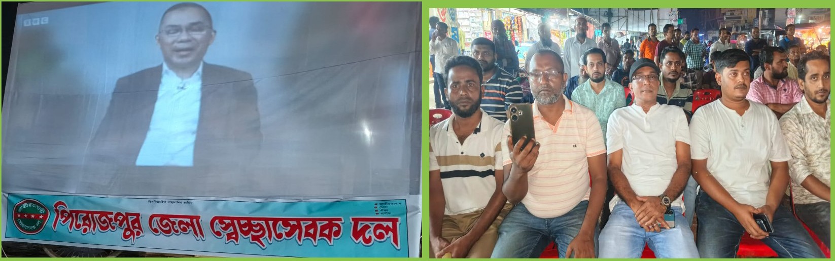 পিরোজপুর জেলা স্বেচ্ছাসেবকদলের উদ্যোগে গত ০৬ অক্টোবর তারেক রহমানের দেয়া বিবিসি সাক্ষাৎকারের উন্মুক্ত গণ প্রদর্শনী অনুষ্ঠিত হয়েছে। সোমবার (১২ অক্টোবর) সন্ধ্যা ৭টায় পিরোজপুর সদর উপজেলা গেটের সামনে উন্মুক্ত স্থানে এই প্রদর্শনী অনুষ্ঠিত হয়। এ সময় উপস্থিত ছিলেন পিরোজপুর জেলা স্বেচ্ছাসেবক দলের আহ্বায়ক মনিরুজ্জামান মনি,জেলা স্বেচ্ছাসেবকদলের সদস্য সচিব তৌহিদুল ইসলাম তৌহিদ,সিঃযুগ্ম আহবায়ক নাদিম শেখ,যুগ্ম আহবায়ক আসিব জামাল খান,যুগ্ম আহবায়ক এম এ মাসুদ হাওলাদার,যুগ্ম আহবায়ক আশরাফুল আলম সজল,যুগ্ম আহবায়ক আজিজুল হক নবীন,যুগ্ম আহবায়ক তরিকুল ইসলাম রনি,যুগ্ম আহবায়ক মোঃএমাদুল খান,আহবায়ক কমিটির সদস্য মোঃ মোফাজ্জেল শেখ,মোঃ শামীম গাজী,সদর উপজেলা সেচ্ছাসেবকদলের আহবায়ক রিয়াজ মাতুব্বর,সদস্য সচিব সাইদুল ইসলাম,সদর উপজেলা সেচ্ছাসেবক দলের সিঃযুগ্ম আহবায়ক রিয়াজ রায়হান,পৌর সেচ্ছাসেবকদলের আহবায়ক নাদিম মল্লিক,পৌর সেচ্ছাসেবকদলের সদস্য সচিব আহসান দরানী,যুগ্ম আহবায়ক মোঃ মিরাজ হোসাইন,যুগ্ম আহবায়ক মাহামুদ হাসান বাপ্পি,যুগ্ম আহবায়ক শহীদুল ইসলাম,যুগ্ম আহবায়ক হাফিজুল ইসলাম,যুগ্ম আহবায়ক শেখ মতিন,পৌর সেচ্ছাসেবকদলের ১ নং সদস্য খায়রুল ইসলাম,সদস্য জুয়েল মোল্লা। এসময়,জেলা স্বেচ্ছাসেবক দলের আওতাভুক্ত সকল ইউনিটের নেতাকর্মী ছাড়াও বিপুল সংখ্যক সাধারণ মানুষ উপস্থিত ছিলেন।