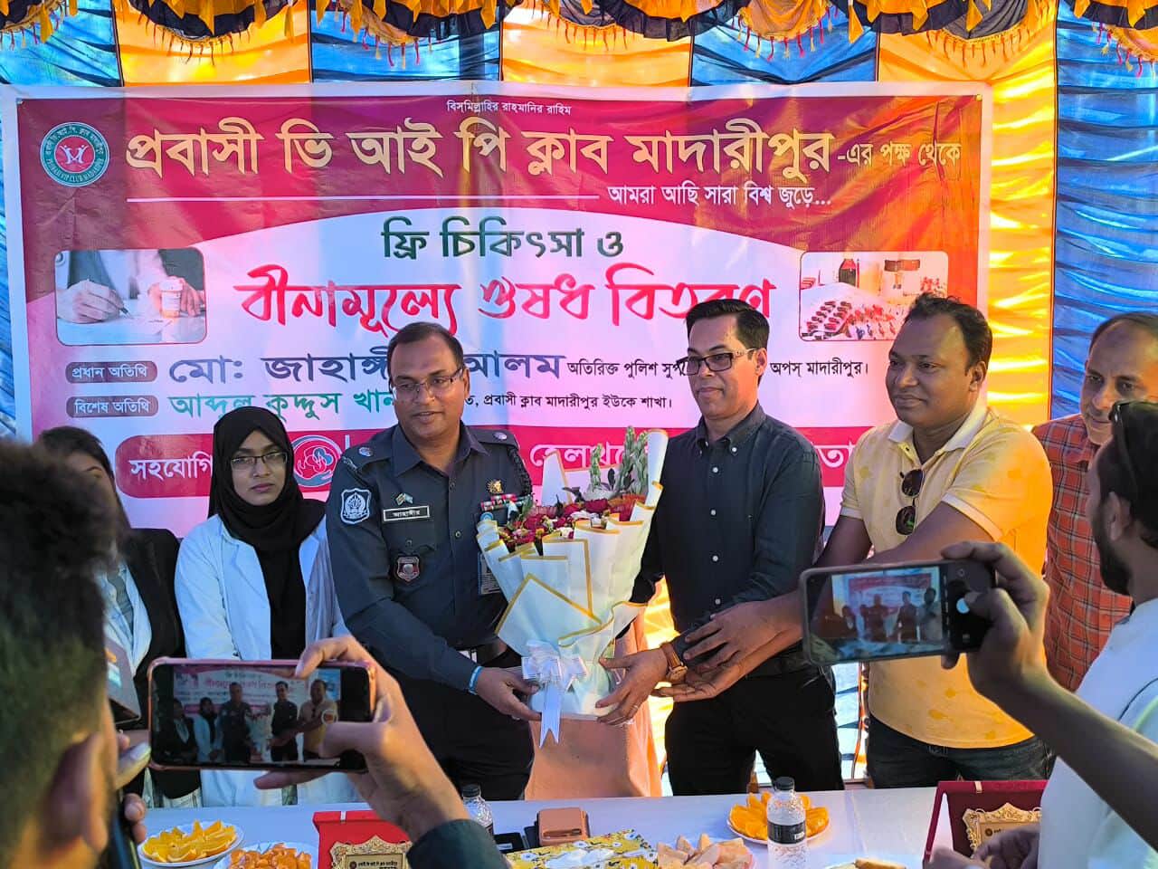 জনকল্যাণমূলক কাজের ধারাবাহিকতায় প্রবাসী ভিআইপি ক্লাব মাদারীপুর বিশ্বের বিভিন্ন দেশে অবস্থানরত প্রবাসীদের সহযোগিতায় বুধবার (১৯ নভেম্বর ২০২৫) মাদারীপুরে বিনামূল্যে চিকিৎসা সেবা ও ঔষধ বিতরণ কর্মসূচির আয়োজন করে। সংগঠনটির পক্ষ থেকে জানানো হয়, সমাজের অসহায় ও দরিদ্র মানুষের কাছে স্বাস্থ্যসেবা পৌঁছে দেওয়া এবং বিনামূল্যে প্রয়োজনীয় ঔষধ বিতরণের মাধ্যমে তাদের পাশে দাঁড়ানোই ছিল এই মহতী উদ্যোগের প্রধান লক্ষ্য। অনুষ্ঠানে প্রধান অতিথি হিসেবে উপস্থিত ছিলেন মাদারীপুর জেলা পুলিশের অতিরিক্ত পুলিশ সুপার (ক্রাইম এন্ড অপস) মো: জাহাঙ্গীর আলম। পুরো কর্মসূচিটি সুচারুরূপে পরিচালনা করেন প্রবাসী ভিআইপি ক্লাব মাদারীপুর-এর ইউকে (UK) শাখার সহ-সভাপতি কুদ্দুস খান। তিনি জানান, 'আমরা আছি বিশ্বজুড়ে' এই স্লোগানকে সামনে রেখে প্রবাসীরা সবসময় দেশের মানুষের কল্যাণে কাজ করে যেতে বদ্ধপরিকর। সেবা নিতে আসা শত শত স্থানীয় মানুষ এই উদ্যোগের প্রশংসা করেন।