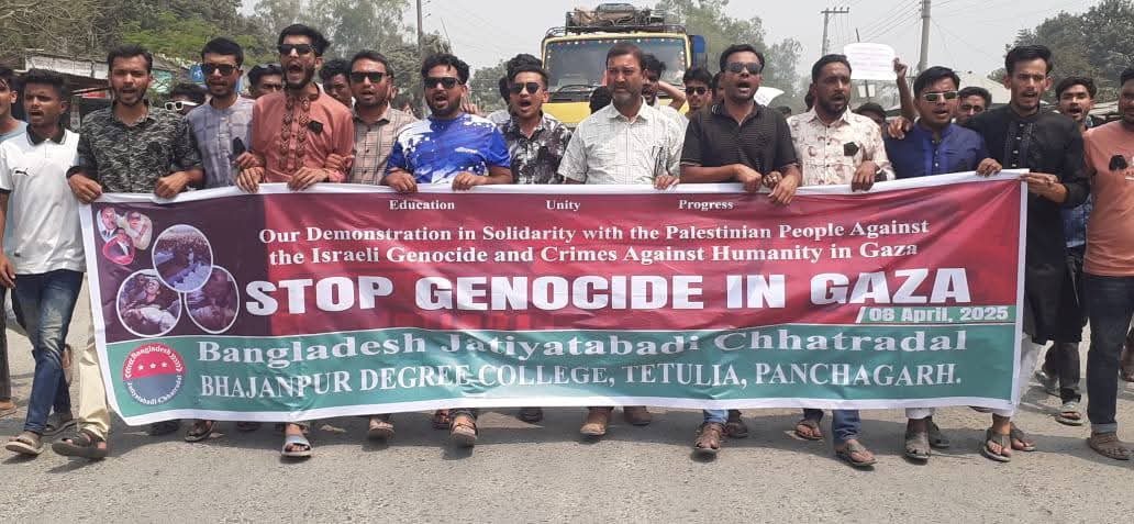 পঞ্চগড়ে তেতুলিয়া উপজেলা ছাত্রদলের উদ্যোগে ফিলিস্তিনের গাজা ও রাফায় গণহত্যার প্রতিবাদে ইসরাইলর বিরোধী বিক্ষোভ মিছিল ও সমাবেশ অনুষ্ঠিত হয়। মঙ্গলবার (৮এপ্রিল) তেঁতুলিয়া সরকারি কলেজ ছাত্রদল ও ভজনপুর ডিগ্রি কলেজ শাখা ছাত্রদলের উদ্যোগে বিক্ষোভ মিছিলটি উপজেলার প্রধান প্রধান সড়ক প্রদক্ষিণ করে ভজনপুর বাজার গোল চত্ত্বরে এসে শেষ হয়। ছাত্রদলের বিক্ষোভ ও সমাবেশে উপস্থিত ছিলেন,উপজেলা সাবেক ছাত্রনেতা হামিদুল হাসান লাবু,উপজেলা ছাত্রদলের আহবায়ক নুরুজ্জামান দুলাল,উপজেলা ছাত্রদলের সদস্য সচিব, আবু বক্কর সিদ্দিক সবুজ,তেঁতুলিয়া সরকারি কলেজ শাখা ছাত্রদলের আহ্বায়ক ইমন,সদস্য সচিব আদনান, ভজনপুর ডিগ্রি কলেজ শাখা ছাত্রদলের আহ্বায়ক আল মামুন, সদস্য সচিব মো শাকিল সহ খালেদা জিয়া বালিকা দি-মুখী উচ্চ বিদ্যালয় ছাত্রীগন ছাত্রদলের বিভিন্ন ইউনিটের নেতৃবৃন্দ। কর্মসূচিতে বক্তারা বলেন, বিশ্ব শক্তিগুলোর নিরবতা অমানবিক ও প্রশ্নবিদ্ধ। অবিলম্বে গাজায় হামলা বন্ধ করতে হবে এবং দখলদারদের বিচারের আওতায় আনতে হবে। বক্তারা আরোও বলেন, অনতিবিলম্বে মার্কিন মদদে গাজায় চলমান গণহত্যার প্রতিবাদে রাষ্ট্রীয়ভাবে নিন্দা জানাতে হবে এবং বৈশ্বিক পরিমণ্ডলে ফিলিস্তিনের পক্ষে জনমত গঠন ও কূটনৈতিক চাপ সৃষ্টি করতে হবে। তেঁতুলিয়া তথা বাংলাদেশ থেকে ইসরাইলের পণ্য সমূহ বয়কট করে দোকান দারদের কেউ তাদের পণ্য বিক্রি করা থেকে বিরত থাকার আহবান জানান বক্তারা।