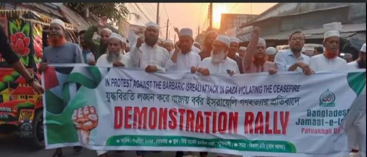 বাংলাদেশ জামায়াতে ইসলামী পটুয়াখালী জেলার আয়োজনে সোমবার (৭ এপ্রিল) বিকাল ০৪ টায় দখলদার ইসরায়েলের গণহত্যা আগ্রাসনের বিরুদ্ধে এক শান্তিপূর্ণ বিক্ষোভ মিছিল অনুষ্ঠিত হয়েছে। বিক্ষোভটি পটুয়াখালী নিউমার্কেট থেকে শুরু করে প্রধান প্রধান সড়ক প্রদক্ষিণ শেষে লঞ্চঘাটে শেষ হয়। মিছিল ও সমাবেশে বক্তব্য দেন পটুয়াখালী -০১ ( দুমকি,মির্জাগঞ্জ,পটুয়াখালী সদর) আসনের বাংলাদেশ জামায়াতে ইসলামীর মনোনীত এমপি পদপ্রার্থী ও পটুয়াখালী জেলা জামায়াতে ইসলামীর আমির, কর্ম পরিষদের সদস্য এ্যাডভোকেট মোঃ নাজমুল আহসান, তিনি ফিলিস্তিনের নির্যাতিত,গণহত্যা বন্ধ, যুদ্ধ বিরতি ও আন্তর্জাতিক সম্প্রদায়ের প্রতি জোরালো ভূমিকা রাখার দাবি জানান। এ সময় তিনি বলেন,”ফিলিস্তিনের মানুষের ওপর ইসরায়েলের অব্যাহত গণহত্যা,নিপীড়ন ও আগ্রাসন মানবতার বিরুদ্ধে বিশ্ববাসীকে এই অন্যায়ের বিরুদ্ধে রুখে দাঁড়াতে হবে। মিছিলে অংশগ্রহণকারীরা ইসরায়েলের বিরুদ্ধে বিভিন্ন স্লোগান দেন এবং ফিলিস্তিনের মানুষের প্রতি সংহতি প্রকাশ করেন। তারা ফিলিস্তিনের গণহত্যা বন্ধ সহ বিশ্বব্যাপী মুসলিম উম্মাহকে সংগঠিত হওয়ার এবং ফিলিস্তিনের মানুষের পাশে দাঁড়ানোর জন্য সবাইকে এগিয়ে আসার আহ্বান জানান। এ সময় অন্যান্যের মধ্যে উপস্থিত ছিলেন,এবিএম সাইফুল্লাহ কেন্দ্রীয় মজলিসের শুরা সদস্য,ও পটুয়াখালি জেলা কর্ম পরিশোধ সদস্য।অধ্যাপক, শহিদুল ইসলাম আল কায়সারী,বাংলাদেশ জামায়াতে ইসলামী জেলা সেক্রেটারি। পৌর আমির মাওলানা আবুল বাশার,প্রমুখ্য।