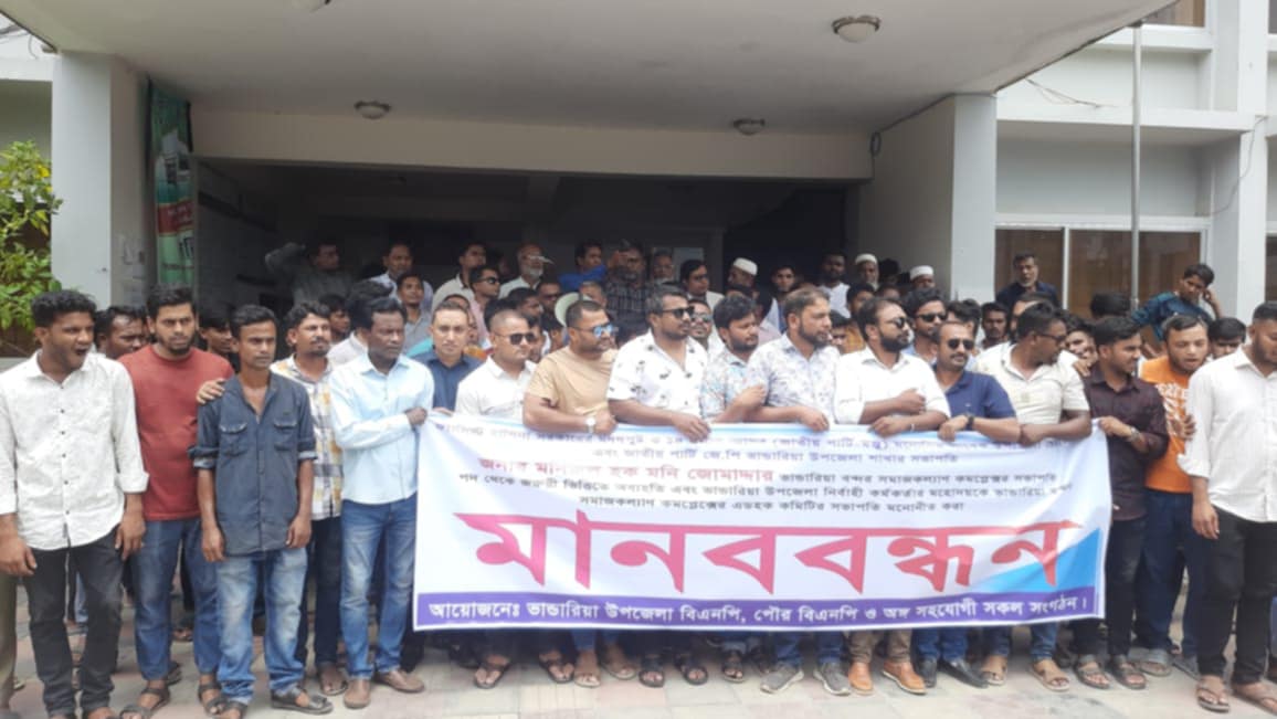 অদ্য (বৃহস্পতিবার)১৭ এপ্রিল দুপুর ১২ ঘটিকার সময় পিরোজপুর জেলার ভান্ডারিয়া উপজেলায় জাতীয় পার্টি (জেপি-মঞ্জু) এর মনোনীত সাবেক উপজেলা চেয়ারম্যান ও জাতীয় পার্টি জে.পি.ভান্ডারিয়া উপজেলা শাখার বর্তমান সভাপতি মনিরুল হক মনি জমাদ্দার কে ভান্ডারিয়া বন্দর সমাজ কল্যাণ কমপ্লেক্সের সভাপতি পদ থেকে জরুরি ভিত্তিতে অব্যহতির দাবিতে এবং ভান্ডারিয়া উপজেলা নির্বাহী কর্মকর্তাকে ভান্ডারিয়া বন্দর সমাজ কল্যাণ কমপ্লেক্সের এডহক কমিটির সভাপতি মনোনীত করার দাবিতে ভান্ডারিয়া উপজেলা পরিষদ চত্বরে ভান্ডারিয়া উপজেলা বিএনপি,পৌর বিএনপি ও অঙ্গ সহযোগী সকল সংগঠনের (উপজেলা বিএনপির আহবায়ক আহমেদ সোহেল মঞ্জু সুমন গ্রুপ) আয়োজনে প্রায় দুইশত নেতাকর্মীদের উপস্থিতিতে বিক্ষোভ মিছিল ও মানববন্ধন করেন। উক্ত বিক্ষোভ মিছিল ও মানববন্ধনে উপস্থিত থেকে বক্তব্য রাখেন মোঃ মনির হোসেন আকন,সদস্য সচিব,উপজেলা বিএনপি ভান্ডারিয়া। আতিকুল ইসলাম মান্না,সিনিয়র সহ-সভাপতি,গণ অধিকার পরিষদ পিরোজপুর জেলা শাখা। মোঃ জুবায়ের হোসেন,সভাপতি,গণ অধিকার পরিষদ ভান্ডারিয়া উপজেলা শাখা।মাসুদ রানা পলাশ, সদস্য সচিব, পৌর বিএনপি ভান্ডারিয়া। মিরাজ হাওলাদার,যুগ্ম আহ্বায়ক,
