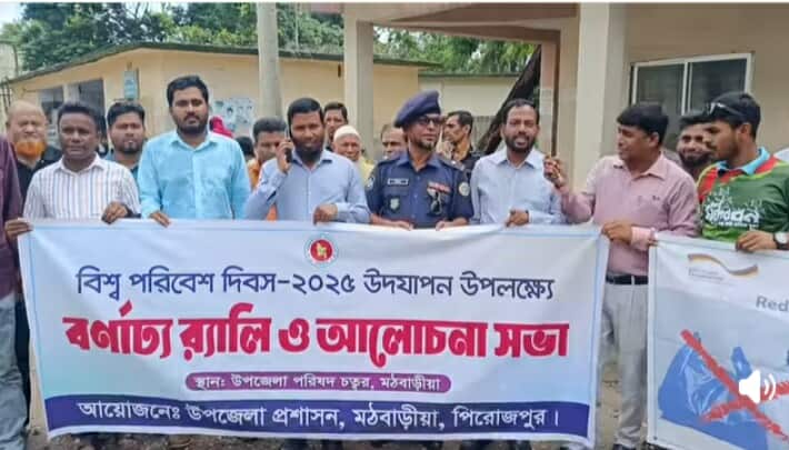 পিরোজপুরের মঠবাড়ীয়া বুধবার (২৫জুন,২০২৫) বিশ্ব পরিবেশ দিবস উদযাপিত হয়। দিবসের প্রতিপাদ্য " গাছ লাগাও,পরিবেশ রক্ষা কর '' এই শ্লোগান সামনে রেখে উপজেলা নির্বাহী অফিসার, মঠবাড়ীয়া আব্দুল কাইয়ুম এর নেতৃত্বে ও উপজেলার বিভিন্ন দপ্তরের কর্মকর্তাদের উপস্হতিতে এক বর্ণাঢ্য রেলি ও শোভাযাত্রা অনুষ্ঠিত হয় এবং উপজেলা পরিষদ মিলনায়তনে আলোচনা সভা অনুষ্ঠিত হয়। আলোচনা সভায় সভাপতিত্ব করেন,উপজেলা নির্বাহী অফিসার আব্দুল কাইয়ুম। আলোচনা সভায় উপজেলা নির্বাহী অফিসার আব্দুল কাইয়ুম, উপজেলা পল্লী উন্নয়ন কর্মকর্তা,প্রকল্প বাস্তবায়ন কর্মকর্তা, ওসি(তদন্ত) আ: হালিম বক্তব্যে রাখেন। বক্তারা পরিবেশ রক্ষার জন্য গাছ লাগানোর উপর গুরুত্ব আরোপ করেন এবং সকলকে গাছ লাগানোর আহবান জানান।