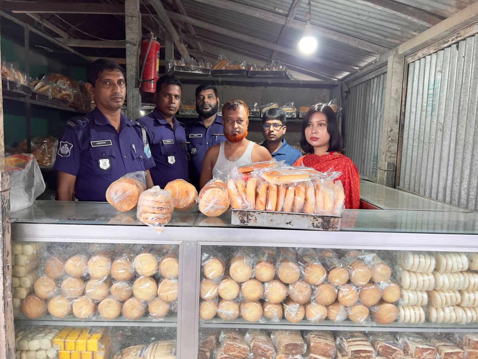 পাউরুটি ও কেকের মোড়কের গায়ে উৎপাদন-মেয়াদোত্তীর্ণের তারিখ ও বিক্রয়মূল্য লিপিবদ্ধ না থাকা, ব্যবসা পরিচালনার ট্রেড লাইসেন্স প্রদর্শন করতে না পারা এবং অস্বাস্থ্যকর পরিবেশে রুটি-বিস্কুট-কেক তৈরির অপরাধে ভোক্তা অধিকার সংরক্ষণ আইন, ২০০৯ অনুসারে ফ্যাক্টরির মালিককে ১৫ হাজার টাকা জরিমানা করা হয়।