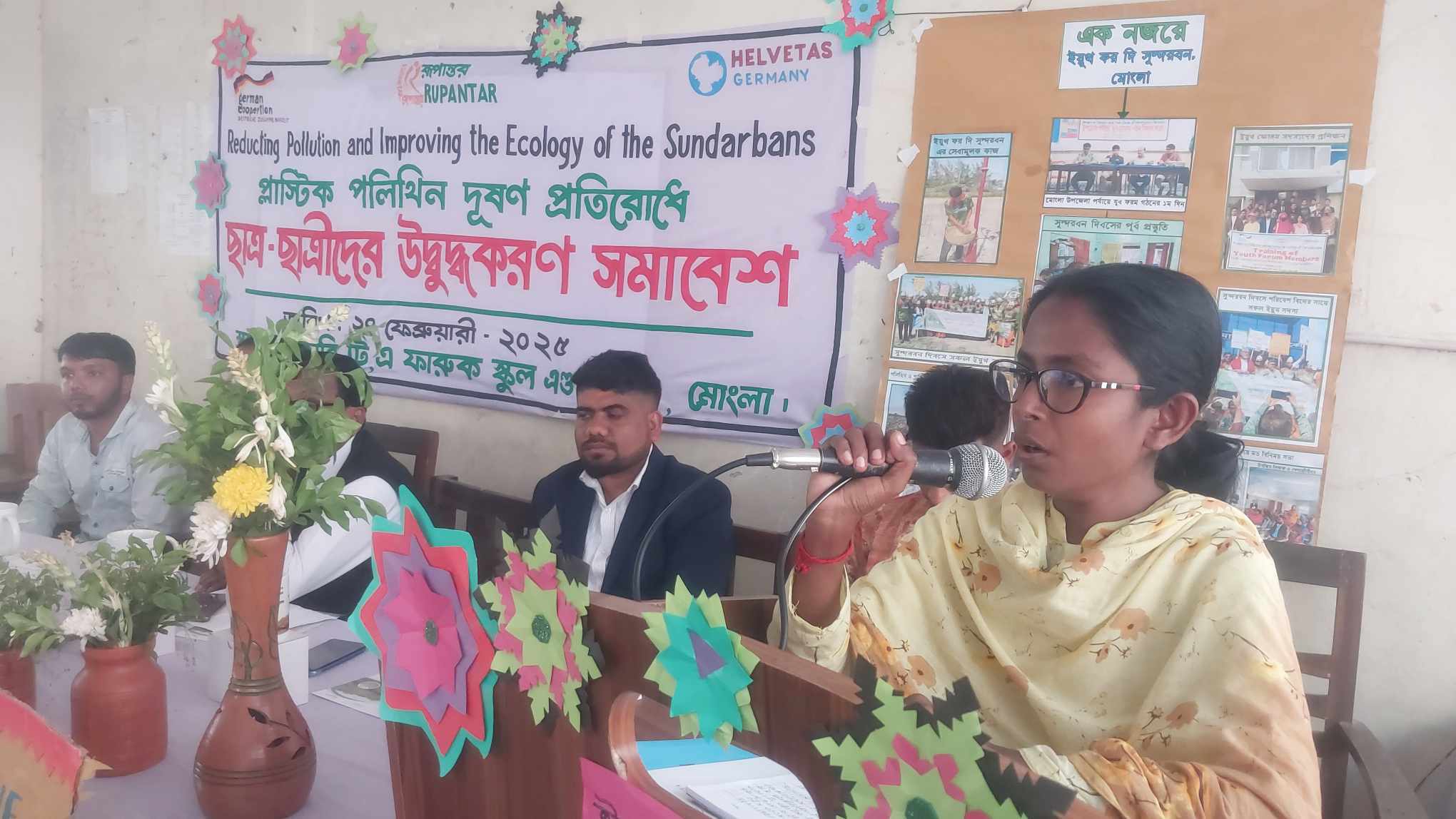 মোংলায় রুপান্তরের আয়োজনে প্লাস্টিক পলিথিন দূষণ প্রতিরোধে ছাত্র ছাত্রীদের উদ্বুদ্ধকরণ সমাবেশ ও কুইজ প্রতিযোগিতা অনুষ্ঠিত হয়েছে। বৃহস্পতিবার (২৭ ফেব্রুয়ারি) বেলা ১২টায় সরকারি টি এ ফারুক স্কুল এন্ড কলেজ ছাত্র-ছাত্রীদের নিয়ে এ উদ্বুদ্ধকরণ সমাবেশ অনুষ্ঠিত হয়। এসময় বক্তারা বলেন, ব্যবহারের পর আমরা যে প্লাস্টিক-পলিথিন ফেলে দেই, তা মাটি ও পানিতে অপচনশীল অবস্থায় মিশে যায়। দীর্ঘ সময় পরিবেশে অবস্থানের ফলে প্লাস্টিক দ্রব্যাদি মাইক্রোপ্লাস্টিকে পরিণত হয় এবং সরাসরি প্রাণীর খাদ্যচক্রে প্রবেশ করে। ফলে মানবজাতি ও প্রাণিকুল নানা ধরনের প্রাণঘাতী রোগে আক্রান্ত হচ্ছে। বিজ্ঞানীরা মায়ের বুকের দুধে মাইক্রোপ্লাস্টিকের উপস্থিতি পেয়েছেন। তাই প্লাস্টিকের বিকল্প ব্যবহারে তাদের উদ্যোগী হতে হবে। প্লাস্টিকের মাইক্রোকণা নিউরনের সঙ্গে মিশে নিউরন, তথা মস্তিষ্ককে অকার্যকর করে তোলে। স্বাভাবিক চিন্তাশক্তিকে দুর্বল করে দেয়। প্লাস্টিক ও পলিথিনের যথেচ্ছ ব্যবহার পরিবেশকে বিষাক্ত করে তুলছে। এ থেকে বাঁচতে হলে অবশ্যই প্লাস্টিক-পলিথিন বর্জন করতে হবে।