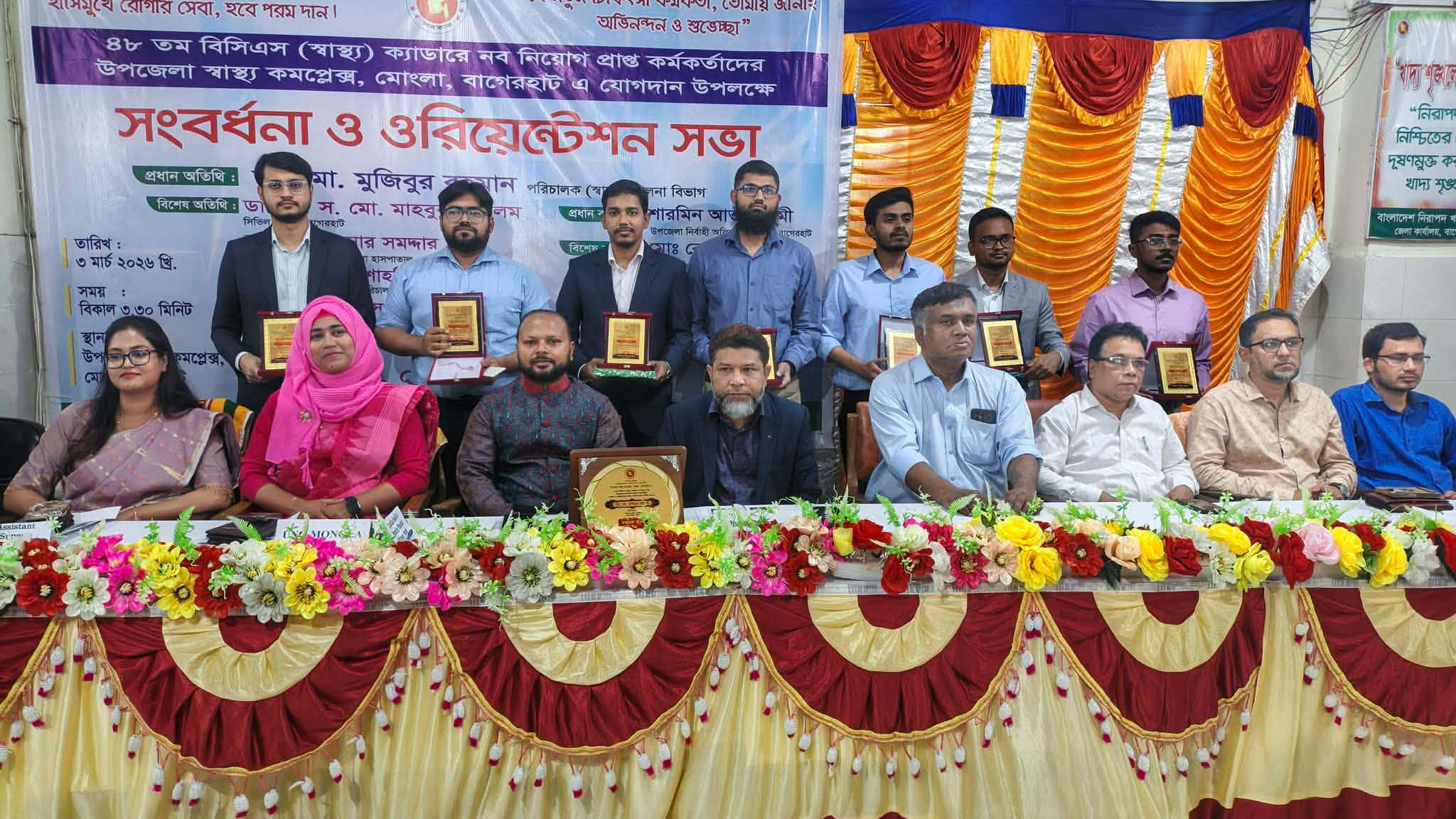 "গায়ে সাদা এপ্রন, গলায় স্টেথোস্কোপ—হাসিমুখে রোগীর সেবা হবে পরম দান। হে নতুন চিকিৎসা কর্মকর্তা, তোমায় জানাই অভিনন্দন ও শুভেচ্ছা”—এই স্লোগানকে সামনে রেখে বাগেরহাটের মোংলায় ৪৮তম বিসিএস (স্বাস্থ্য) ক্যাডারে নবনিয়োগপ্রাপ্ত চিকিৎসা কর্মকর্তাদের যোগদান উপলক্ষে সংবর্ধনা ও ওরিয়েন্টেশন সভা অনুষ্ঠিত হয়েছে। মঙ্গলবার (৩ মার্চ ২০২৬) বিকাল ৩টা ৩০ মিনিটে উপজেলা স্বাস্থ্য কমপ্লেক্স, মোংলা মিলনায়তনে এ আয়োজন করা হয়।