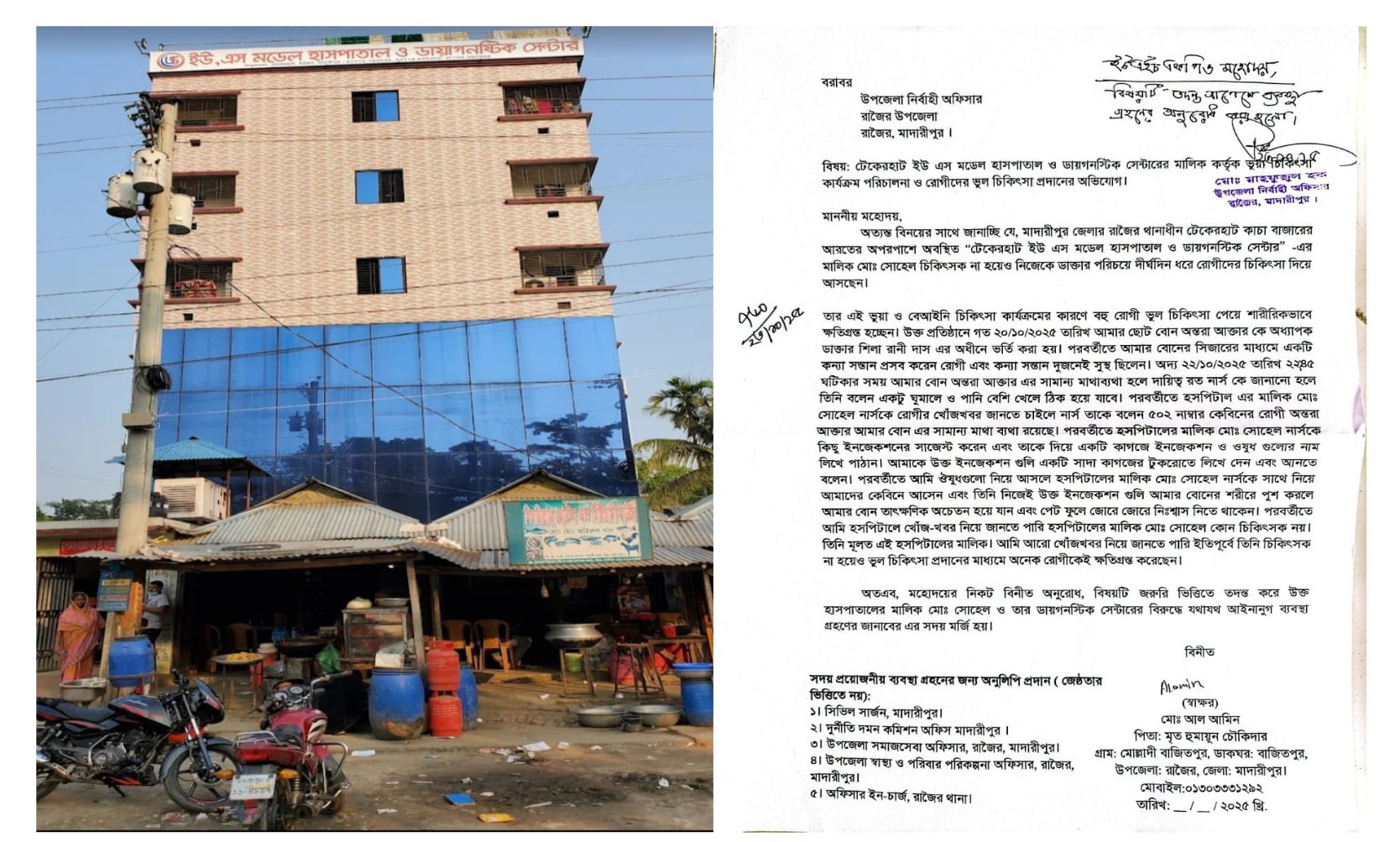 মাদারীপুর জেলা, রাজৈর থানাধীন, টেকেরহাট কাচামাল আরতের অপর পাশে ইউ এস মডেল হাসপাতাল এন্ড ডায়াগনস্টিক সেন্টারে এই হাসপাতালের ডাক্তার অধ্যাপক শিরা রানী কে শুরু থেকে দেখিয়ে আসতেছেন অন্তরা আক্তার।২০/১০/২০২৫ইং তারিখে অন্তরা আক্তার কে ভর্তী করেন অধ্যাপক ডাক্তার শিলা রানী, রাত ১০ ঘটিকার দিকে অন্তরা আক্তার কে সিজার করে, একটি কন্যা সন্তান প্রসব করে৷ মা ও সন্তান দুজনেি সুস্থ ছিলো হঠাৎ ২২/১০/২০২৫ইং অন্তরা আক্তারের অল্প অল্প মাথা ব্যথা করছে বলে তার ভাইয়ের কাছে, মোঃ আলামিন দায়িত্বরত নার্সে কে ডাকে কিন্তু নার্স এসে বলে একটু ঘুমালে মাথা ব্যাথা ঠিক হয়ে যাবে, পানি বেশি খাবেন, দায়িত্বরত নার্স দ্রুত গিয়ে মোঃ সোহেল কে ডেকে নিয়ে আসে (৫০২) নাম্বার কেবিনে তিনি এসে নার্সের হাতে একট সাদা কাগজে কয়েকটি ইনজেকশন লিখে দেয়। নার্স অন্তরার ভাই মোঃ আলামিন কে বলে এই ইনজেকশন গুলো তাড়াতাড়ি নিয়ে আসেন তরিগড়ি করে নিয়ে আসে। ।মোঃ সোহেল নিজের হাতে ইনজেকশন পুষ করে তার পর পরই অন্তরা আক্তার অচেতন হয়ে যায় এবং পেট ফুলে যায়। অন্তরার ভাই আলামিন খোজ খবর নিয়ে দেখে মোঃ সোহেল ইউ এস মডেল হাসপাতাল এন্ড ডায়াগনস্টিক সেন্টারের মালিক তিনি আরো রোগীর এই ধরনের ভূয়া চিকিৎসা দিয়ে আসছে অনেক দিন যাবত।