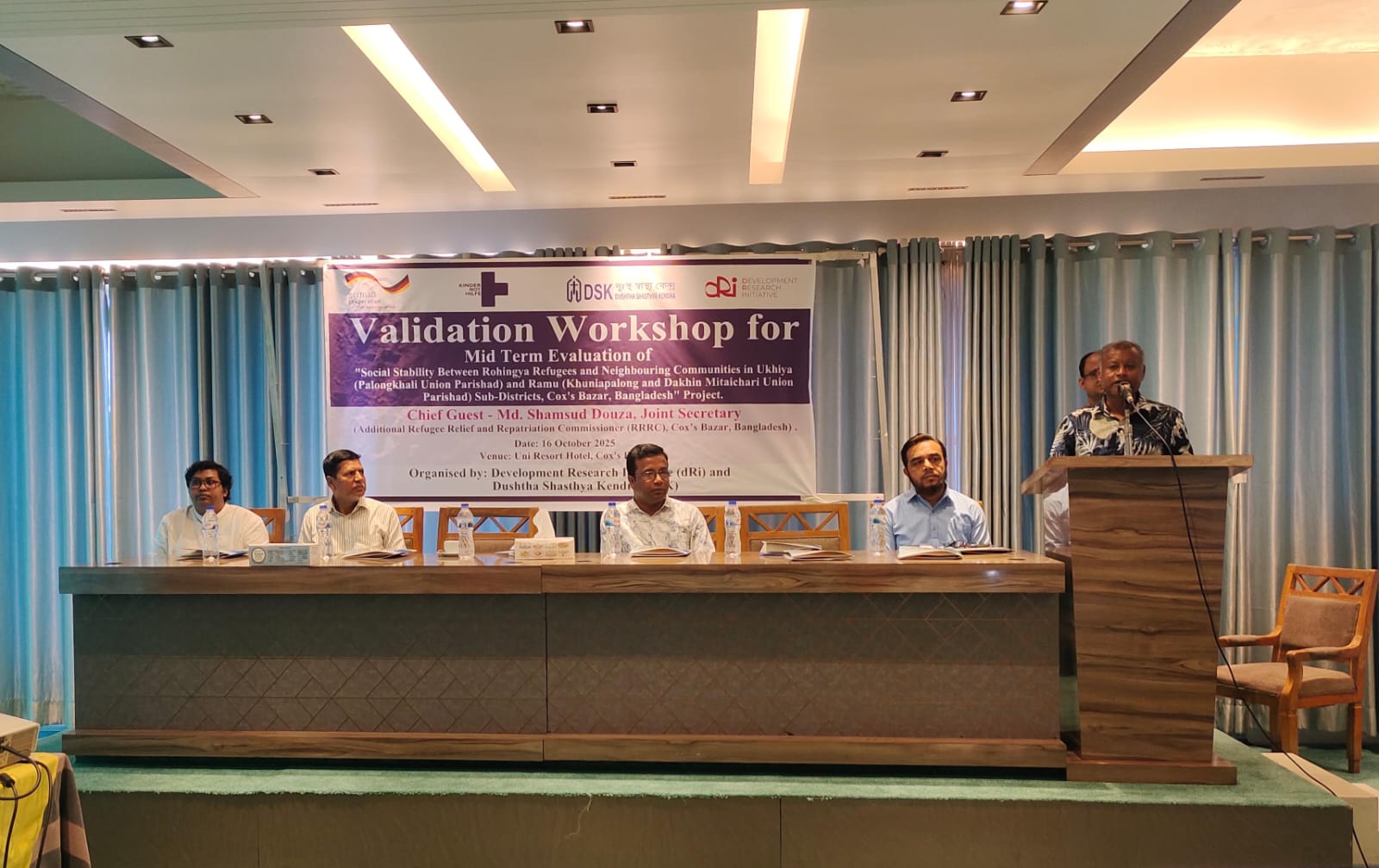 কর্মশালার মূল উদ্দেশ্য ছিল মধ্যবর্তী মূল্যায়ন প্রতিবেদন, মূল অন্তর্দৃষ্টি, সুপারিশ, শিক্ষা ও ভবিষ্যৎ অ্যাডভোকেসি কৌশল শেয়ার করা। এই মূল্যায়ন পরিচালনা করেছে ডেভেলপমেন্ট রিসার্চ ইনিশিয়েটিভ (dRi), বাংলাদেশ, যা রোহিঙ্গা শরণার্থী ও প্রতিবেশী হোস্ট কমিউনিটির মধ্যে সামাজিক স্থিতিশীলতা বৃদ্ধির জন্য প্রমাণভিত্তিক তথ্য প্রদান করেছে। অনুষ্ঠানে প্রধান অতিথি হিসেবে উপস্থিত ছিলেন মো. শামসুদ দৌজা, যুগ্ম সচিব ও অতিরিক্ত শরণার্থী ত্রাণ ও প্রত্যাবাসন কমিশনার (RRRC), কক্সবাজার। বিশেষ অতিথি হিসেবে উপস্থিত ছিলেন ফিরোজা আখতার, সহকারী কমিশনার ও নির্বাহী ম্যাজিস্ট্রেট, এনজিও সেল, কক্সবাজার এবং মোয়াজ্জেম হোসেন, উপপরিচালক, যুব উন্নয়ন অধিদপ্তর, কক্সবাজার। কর্মশালাটি যৌথভাবে আয়োজন করেছে দুঃস্থ স্বাস্থ্য কেন্দ্র (DSK) এবং ডেভেলপমেন্ট রিসার্চ ইনিশিয়েটিভ (dRi)। আলোচনা পরিচালনা ও কার্যক্রমের নেতৃত্ব দিয়েছেন প্রদীপ কুমার রায়, যুগ্ম পরিচালক (প্রকল্প), DSK; অনিন্দ্য বড়াই, প্রধান, গবেষণা ও অপারেশনস, dRi; এবং ড. সাজ্জাদুল আলম, টিম লিডার (মূল্যায়ন) ও সহযোগী অধ্যাপক, নৃবিজ্ঞান বিভাগ, জাহাঙ্গীরনগর বিশ্ববিদ্যালয়। কর্মশালায় সরকারি কর্মকর্তা, স্থানীয় নেতা, কমিউনিটি ভিত্তিক সংগঠন, যুব প্রতিনিধি, এনজিও/আইএনজিও এবং উন্নয়ন সহযোগী প্রতিষ্ঠান অংশগ্রহণ করেন। তারা সহযোগিতা বৃদ্ধির, শান্তি প্রতিষ্ঠার এবং সামাজিক সম্প্রীতি জোরদারের মাধ্যমে টেকসই শান্তি ও সহনশীলতা নিশ্চিত করার বিষয়ে মতবিনিময় ও অভিজ্ঞতা ভাগাভাগি করেন।