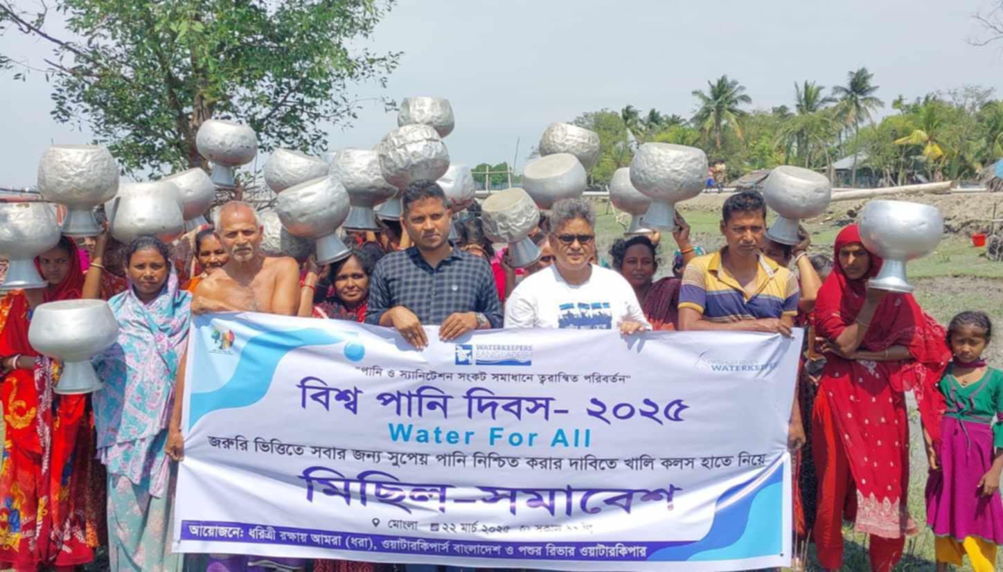 লবণাক্ত পানি পানে উপকূলের নারীদের জরায়ু সংক্রমণ বেড়েছে। উপকূলের ৭৩% মানুষ সুপেয় পানি থেকে বঞ্চিত। বাংলাদেশের উপকূলের ১৯ জেলার ৩ কোটি মানুষ আধারযোগ্য পানি সংগ্রহ করতে পারেনা। দেড় কোটি মানুষ ভূগর্ভস্থ লবণাক্ত পানি পানে বাধ্য হচ্ছেন। উপকূলীয় অঞ্চলকে পানি সংকটাপন্ন এলাকা হিসেবে ঘোষণা দিয়ে জরুরি ভিত্তিতে সবার জন্য সুপেয় পানি নিশ্চিত করতে হবে। শনিবার (২২ মার্চ) সকাল ১১টায় মোংলার দক্ষিণ কাইনমারিতে পশুর নদীর পাড়ে বিশ্ব পানি দিবস উপলক্ষে খালি কলস হাতে নিয়ে মিছিল শেষে অনুষ্ঠিত সমাবেশে বক্তারা একথা বলেন। পশুর রিভার ওয়াটারকিপার পরিবেশযোদ্ধা মোঃ নূর আলম শেখ'র সভাপতিত্বে উপকূলীয় নরীদের অংশগ্রহণে এ মিছিল এবং সমাবেশের আয়োজন করে ধরিত্রী রক্ষায় আমরা (ধরা), ওয়াটারকিপার্স বাংলাদেশ ও পশুর রিভার ওয়াটারকপার। সমাবেশে অন্যান্যদের মধ্যে বক্তব্য রাখেন ধরিত্রী রক্ষায় আমরা (ধরা) এর নেত্রী কমলা সরকার, সার্ভিস বাংলাদেশ'র সভাপতি মোস্তাফিজুর রহমান মিলন, ওয়াটারকিপার্স বাংলাদেশ'র হাছিব সরদার, পশুর রিভার ওয়াটারকিপার ভলান্টিয়ার চন্দ্রিকা মন্ডল, রত্না শেখ, তন্বী মন্ডল প্রমূখ। সভাপতি বক্তৃতায় পশুর রিভার ওয়াটারকিপার মোঃ নূর আলম শেখ বলেন, আমরা পরিস্কার এবং নিরাপদ পানির হুমকির বিরুদ্ধে লড়াই করছি। আমরা লড়াই করছি পানীয় উপযোগী, মাছের বসবাসের উপযোগী এবং গোসল করার উপযোগী পানির জন্য। তিনি আরো বলেন পানির আরেক নাম জীবন তাই জরুরি ভিত্তিতে উপকূলের সুপেয় পানির সংকটের সমাধান করতে হবে। পানি সংরক্ষণের অবকাঠামো নির্মান এবং পানি সম্পদের টেকসই ব্যবস্থাপনা করতে হবে। ধরা’র নেত্রী কমলা সরকার বলেন মাইলের পর মাইল পাড়ি দিয়ে খাবার পানি নারীকেই সংগ্রহ করতে হচ্ছে। ফলে নষ্ট হচ্ছে নারীর শ্রমঘন্টা। বাংলাদেশের দক্ষিণাঞ্চলে সমুদ্র থেকে ভূভাগের অনেক ভিতর পর্যন্ত লবণ পানি ঢুকে পড়েছে। লোকজনকে পানি ও খাবারের সাথে তুলনামূলক বেশি পরিমাণে লবণ গ্রহণ করতে হচ্ছ। নারীদের স্বাস্থ্য ঝুঁকি বেড়েছে। লবণাক্ত এলাকায় গর্ভবতী মায়েদের প্রি-একলেম্পশিয়া ও উচ্চ রক্তচাপের হার বেড়েছে। পশুর রিভার ওয়াটারকিপার ভলান্টিয়ার রত্না শেখ বলেন উপকূলীয় সকল মানুষের খাবার পানির টেকসই সমাধান করতে হবে। মিঠা পানির উৎস ভরাট, দখল ও দূষণ বন্ধ করতে হবে। নিরাপদ পানির সার্বজনীন, ন্যায্যতা ও সহজলভ্যতা নিশ্চিত করতে ২০২৫-২৬ অর্থবছরে বাজেটে বিশেষ বরাদ্দ দিতে হবে। সমবেশের আগে পশুর নদীর পাড়ে খালি কলস হাতে নিয়ে উপকূলীয় নারীরা মিছিল করেন।