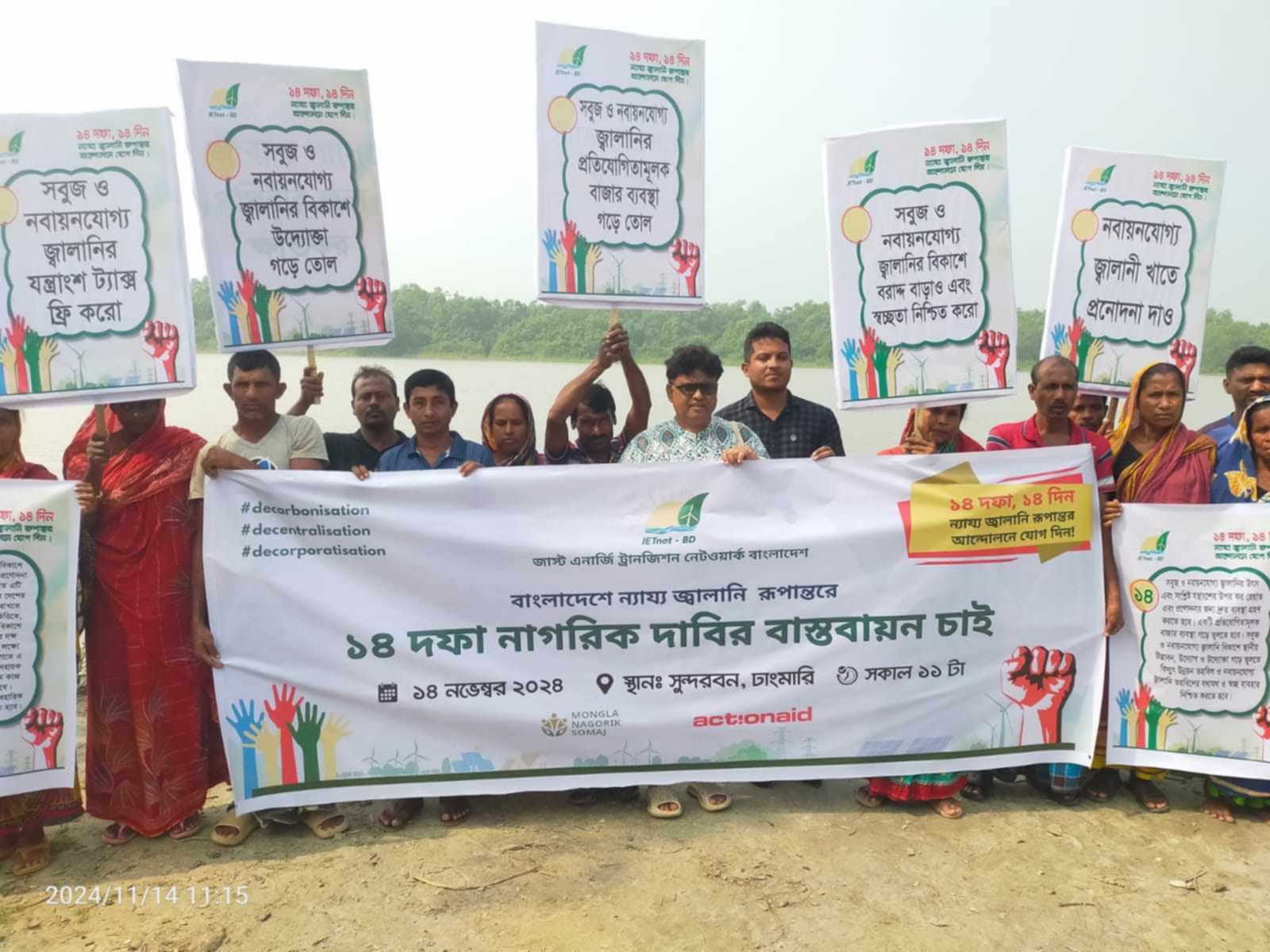 জলবায়ু পরিবর্তনের হারকে ধীরগতি করা এব্ং ভবিষ্যত প্রজন্মের জন্য একটি বাসযোগ্য পৃথিবী নির্মানের লক্ষ্যে জীবাশ্ম জ্বালানি নির্ভরতা কমানো অত্যন্ত জরুরি। তাই সবুজ ও নবায়নযোগ্য জ্বালানির উৎস এবং যন্ত্রাংশ ট্যাক্স ফ্রি করতে হবে। নবায়নযোগ্য জ্বালানিখাতে প্রণোদনা দিতে হবে। সবুজ ও নবায়নযোগ্য জ্বালানির প্রতিযোগিতামূলক বাজার ব্যবস্থা এবং এই খাতের বিকাশে উদ্যোক্তা গড়ে তুলতে হবে। বিদ্যুৎ উন্নয়ন তহবিল ও নবায়নযোগ্য জ্বালানি তহবিলের যথাযথ এবং স্বচ্ছ ব্যবহার নিশ্চিত করতে হবে। "১৪ দফা ১৪দিন, ন্যায্য জ্বালানি রূপান্তর আন্দোলনে যোগদিন" শ্লোগানে ন্যায্য জ্বালানি রূপান্তরে দেশব্যাপী প্রচারণা কার্যক্রমের অংশ হিসেবে সমাপনী দিনে বৃহস্পতিবার (১৪ নভেম্বর) সকাল ১১টায় সুন্দরবনের ঢাংমারিতে বনজীবীদের অংশগ্রহণে অবস্থান কর্মসুচি পালিত হয়। জাস্ট এনার্জি ট্রানজিশন নেটওয়ার্ক বাংলাদেশ 'জেটনেট বিডি' এ্যাকশন এইড বাংলাদেশ ও মোংলা নাগরিক সমাজের যৌথ আয়োজনে এ অবস্থান কর্মসুচি পালিত হয়।